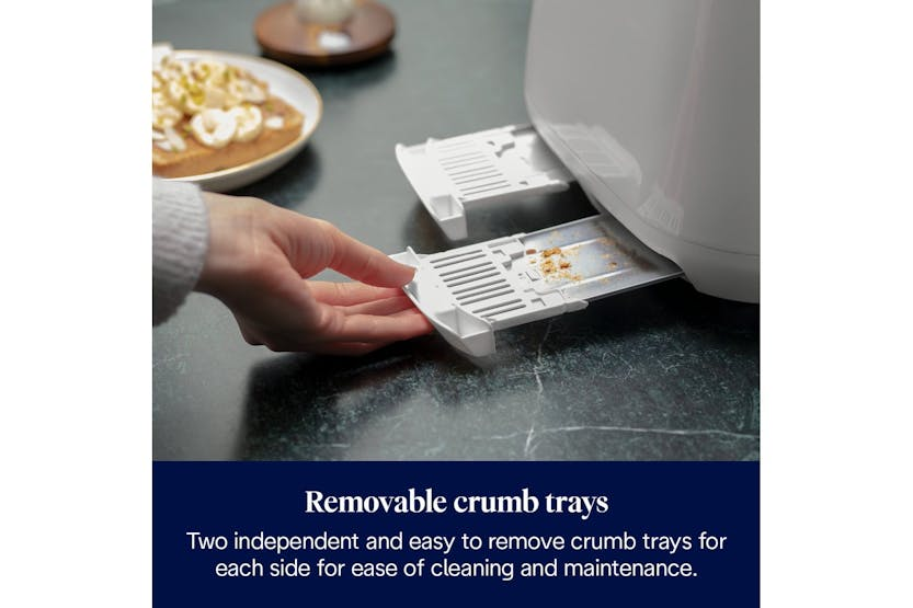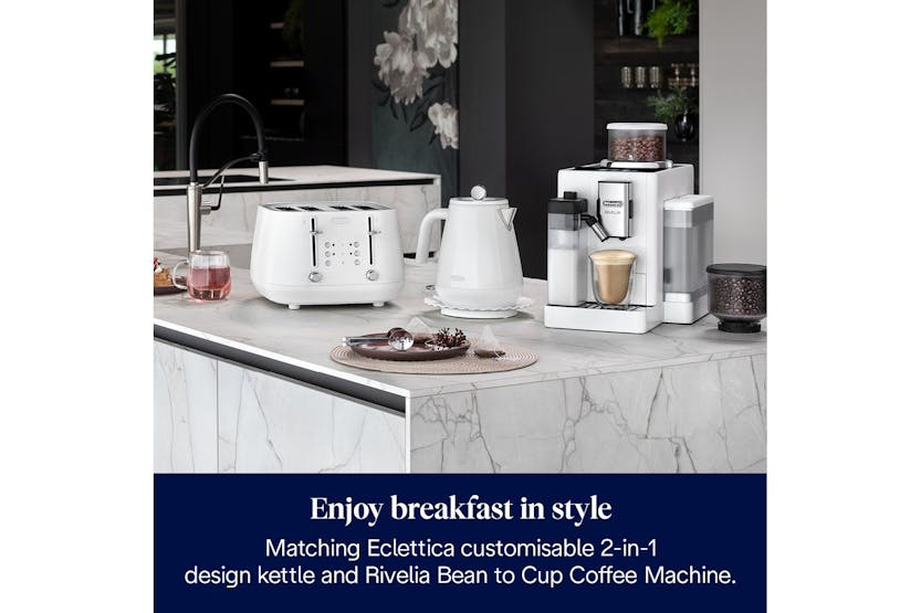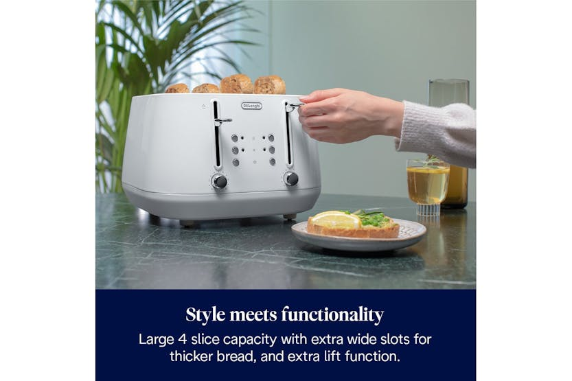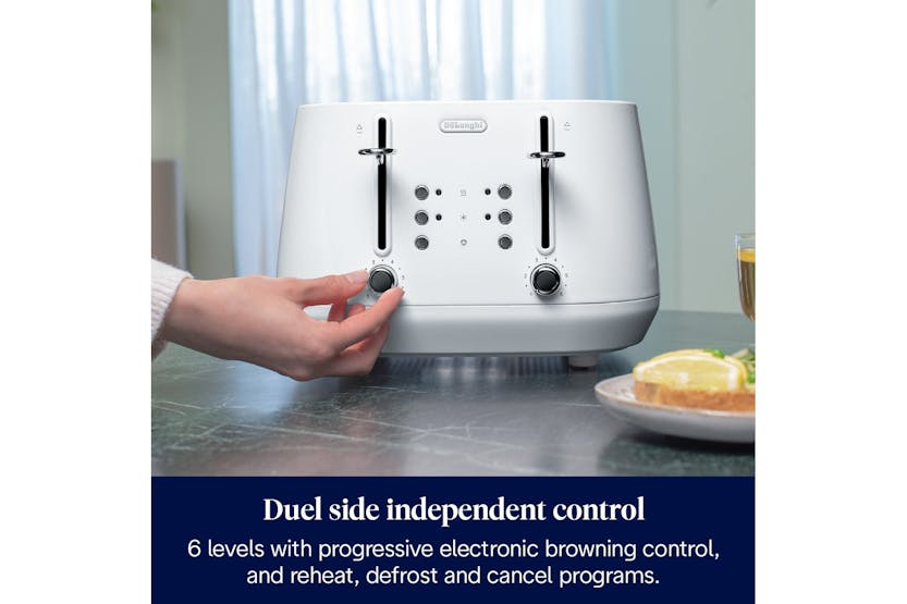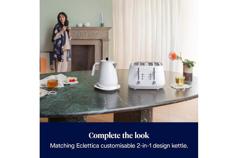Description Check out the video: Celebrate your uniqueness and eclecticism with the masterfully modelled De'Longhi Eclettica 4-slice toaster. Its unmistakable design is rich in Italian style and complete with modern, gentle lines. Wide slots, progressive browning controls and the extra-lift position make it easy to toast a range of breads, bagels and crumpets to your preferences, with independent side operation. Browning Controls Create breakfast treats to everyone's individual preferences with electronic pre-set toasting functions, including defrost, reheat and cancel, with progressive browning controls. Crumb Tray Convenient cleaning thanks to the fully removable crumb tray, preventing breadcrumbs from building up in the toaster and keeping your worktop neat and tidy. Extra-Lift Position The exclusive extra-lift position is designed for easy removal of small slices. Product Features: Toast to your tastes with progressive browning controls, plus reheat and defrost settings Independent controls for each side, for toast to suit everyone Easily remove small slices using the extra-lift position Keep your worktops tidy thanks to the removable crumb tray Add an elegant touch to your kitchen with the sleek metal body in a whimsical white