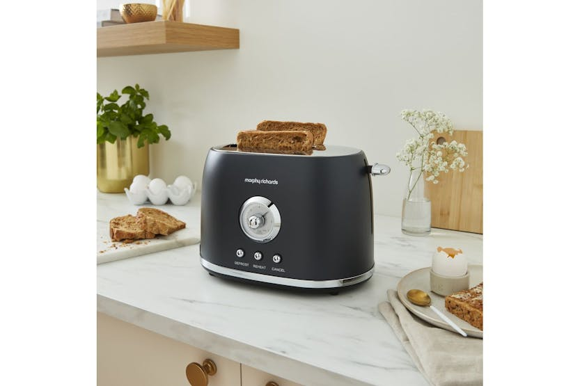Description Online Only Indulge in the luxury of a delicious, perfectly toasted slice of bread with the Morphy Richards Colour Boutique 2 Slice Toaster in Gorgeous Graphite Matt Steel. Seamlessly merging stylish design and reliable functionality, this toaster guarantees perfectly toasted bread, customized to your preferenc. Tailored to suit your vibrant Irish kitchen, this compact toaster delivers to meet your toasting needs without eating up your counter space. Its powerful 850W heating element promises quick toasting, saving you time during busy morning rushes. Make use of the variable browning control to achieve just the hint of toastiness you prefer- light and soft or dark and crispy. This sleek 2-slice toaster adds a touch of contemporary elegance to your kitchen with its Graphite Matt Steel finish. This, coupled with the toaster's retro styling , contributes to a retro-modern aesthetic that pairs well with any kitchen decor style. If you're looking to add a dash of sophistication and a dab of practicality to your countertop, this toaster is the answer. The intuitive Cancel, Reheat, and Defrost functions add flexibility to your breakfast routine. Made from easy to clean durable matt steel, it comes equipped with not just a removable crumb tray for easy cleaning but also cord storage to keep your countertop neat and tidy. This Colour Boutique 2 Slice Toaster by Morphy Richards is designed to cater to your breakfast needs while enhancing your kitchen aesthetics. With its functionality and attractive design, it makes for the perfect accompaniment to your teapot or kettle and the ideal tool to start your mornings right! Product Features Two slice toaster in graphite matt steel finish Varied browning control Convenient function buttons: Cancel, Reheat, Defrost Integrated removable crumb tray Efficient cord storage Powerful 850W element