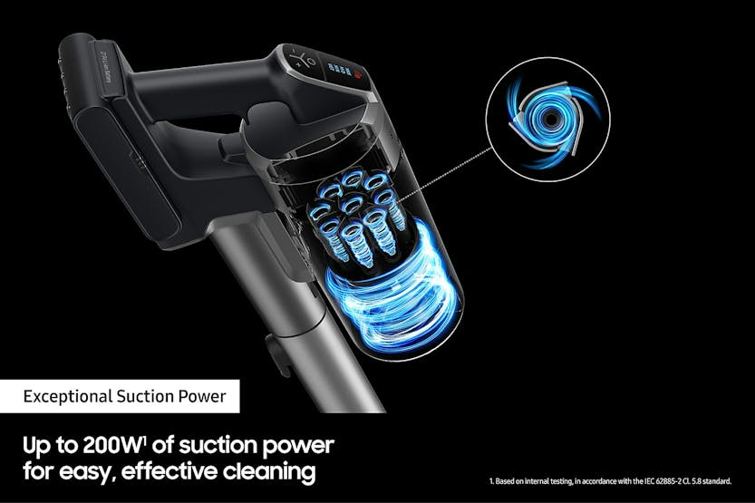 Description Powerfully Thorough Powerfully Effective, but Lightweight: More Advanced Cleaning Performance Clean various types of floor powerfully yet effortlessly with a powerful but lightweight vacuum cleaner. The Digital Inverter Motor generates suction power of up to 200W[1]. The aerodynamic design of the air system optimises the air flow, while multi-cyclonic air filtration efficiently traps fine dust particles. 1. Based on internal testing, in accordance with the IEC62885-2 CL.5.8 standard. Strong Suction Power, Greater Mobility: Digital Inverter Motor Pick up everything from spilt cereal to stubborn pet hair in seconds, thanks to a powerful Digital Inverter Motor which comes with a 10-year parts[1] warranty. Thanks to this optimal structure, the Digital Inverter Motor delivers a strong input power of up to 550W[2], maintains a high level of energy efficiency and generates a suction power up to 200W[2]. 1. The 10 year parts warranty excludes labor costs and is only applicable to Digital Inverter Motors sold from January 2023. 2. Based on internal testing, in accordance with the IEC62885-2 CL.5.8 standard. A Whirlwind Clean: Jet Cyclone Say goodbye to unreachable dust with the extreme suction power of Samsung's Jet Cyclone. With an optimal air path reducing air resistance around the dustbin with 9 separate cyclones and 27 air inlets minimising the loss of suction, you can now breathe easy, knowing your vaccum will deliver consistent performance in any room. Five Step Filtration for Clean Air 99.999% Multi-layered Filtration System Release clean air with a 99.999% Multi-layered Filtration System that traps 99.999% of dust[2]. A main cyclone separates large dust particles picked up in the metal mesh grille filter. The Jet Cyclone and micro filter then catch fine dust while a fine dust filter traps micro dust[1] that can easily escape. 1. Refers to dust particles in the size range of 0.5 to 4.2um. 2. Based on internal testing, in accordance with the IEC 62885-2, CL. 5.11 standard, using the Jet mode. Lightweight Design for Effortless Cleaning Lightweight Design Lightweight design for effortless cleaning means you can clean your home with ease. At just 1.66kg, it's light and easy to handle. With maximum flexibility and strength built in, the lightweight design Samsung vacuum lets you clean all around your home effortlessly. Clean Up to an Hour[1] on a Single Battery Removable and Longer-lasting Battery Clean up to an hour* on a single battery for long cleaning times without recharging. Our high-capacity battery maintains consistent power for up to 1 hour*, and can be easily replaced with a spare battery to clean for up to 2 hours** Retaining 70% of its original performance for up to 500 cycles***. * The stated run time applies when using a high capacity battery (2000mA) and the minimum power level with a non-motorized tool attached. Results may vary depending on actual usage. ** An extra battery will be sold separately as an accessory. ***Maintains 70% capacity after 500 cycles of use, based on the battery package capacity (2000mA). 1 cycle: Full discharge after being full charged (100% ~ 0%). Results may vary depending on actual usage. Based on internal testing. Convenience Easy to Empty & Fully Washable Dustbin Keep the dustbin clean and empty your vacuum cleaner with ease. The 0.8L dustbin, including the multi-cyclone system, is fully washable, so it can be kept clean and fresh. The dustbin can also be removed easily without detaching the pipe from the handheld body. Stay in Control: Digital Display Manually check everything is old school. With a handy digital display you'll see what you need at a glance. Check which suction level you're using, how much charge you have, and even get troubleshooting alerts. Choose Your Ideal Place to Charge: 2-in-1 Charging Station Store and charge your vacuum cleaner flexibly with the 2-in-1 Charging Station. It can be easily adjusted to suit any kind of home. If you want to save space it can be mounted on the wall. Or, if you prefer, you can use it as a stand- alone charger and place it wherever it suits in your home. So you can simply remove the battery and charge it anywhere you like. Brush Floors and Carpets, Done and Dusted: Turbo Action Brush When you're doing the weekly clean, you need a vacuum that picks up dust from all your floors. The Turbo Action Brush spins at around 3750 times a minute" banishing even the tiniest dust particles from wooden floors, tiles, rugs, carpets, you name it. While the 180 degree swivel head easily glides under furniture and gets right into tricky corners too. Tough but Gentle on Hard Floors: Soft Action Brush Tiles to parquet, it's less of a faff to keep your beloved hard floors dust-free. The Soft Action Brush spins around 1,300 times a minut[1], picking up dust particles from hard floors for a microscopic clean. Thanks to anti-static silver threads and the 180 degree swivel head, you can easily change direction and clean every corner. All while the rotating drum stops pet hair getting tangled inside the brush. 1. Based on internal testing using Min, Mid and Max modes. Results may vary depending on individual use. Accessories Effective on Pet Hair: Pet Tool Take the hassle out of removing unsightly pet hair. The compact and easy to maneuver Pet Tool's brush is optimised for picking up pet hairs that are thin and easy to miss by combining a rubber nozzle and bristles. Clean Awkward Areas: Long Reach Crevice Tool Reach into deep crevices or small places, like the back of a sofa, and pick up dust and dirt effectively using the Long Reach Crevice Tool. You can even extend its length up to 43cm to get into awkward spots. Easily Clean Furniture: Combination Tool (Dusting and upholstery tool) Clean various types of furniture effectively. The Combination Tool has an upholstery tool to pick up dirt and also converts to a brush tool for dusting, so it is ideal for a wide variety of surfaces. What's in the Box: Turbo action