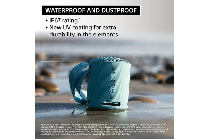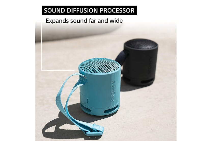 Description Powerful sound in a portable, durable body. Packed with technology to enhance music and filled with usability features, this is a little speaker ready to fit into big lives. The SRS-XB100 speaker provides powerful, clear, expansive sound in a small, portable and durable body. Despite its size, it's packed with technology, including a Sound Diffusion Processor for spreading sound, a passive radiator for deeper bass and an off-centre diaphragm for a clear sound, even at high volumes. Powerful and Clear Sound Packed Into the Compact Body Music is the soundtrack to our lives, and we want you to be able to enjoy your tunes wherever you are. So we’ve packed powerful, clear sound into a portable body. If you love good music and listening with friends, the XB100 is your perfect partner. Send the Sound Around with the Sound Diffusion Processor Don't be fooled by its compact shape, this little speaker packs impressive surround sound. The Sound Diffusion Processor expands sound in any space, with its DSP technology. Listening Outside? No Problem Waterproof and dustproof with an IP67 rating, this speaker is just as good outside as it is inside. Take it to the pool, river or park, and you can listen to your music while you and your friends enjoy the sun. Better Call Quality with Echo Cancelling Need to make a call? No problem. Whether you’re at home or out and about, the built-in microphone lets you enjoy hands-free calling straight through your speaker. And you can count on better, clearer calls with Echo Cancelling, which allows two people to talk at the same time without cutting off either of them. Bluetooth Connection and Fast Pair In one tap, the Sony XB100 enables quick effortless Bluetooth pairing with your Android devices. Passive Radiator for Powerful Sound A passive radiator works together with a full-range speaker to enhance low-end tones, giving bass a boost. Long Live Your Music The XB100 has up to 16 hours of battery life, so that you and your friends can listen to music all day and into the night. The remaining battery percentage shows clearly on your smartphone when the XB100 is connected, letting you know when it's time for a recharge. Aiming to Achieve a Zero Environmental Footprint Inspired by the beauty of the world, we are doing our part to help preserve the Earth while still offering a superior sound quality and listening experience. With a goal of achieving a zero environmental footprint across the entire Sony Group by the year 2050, we are accelerating numerous initiatives for the environment. Add an Extra Speaker for Stereo Sound If you want an even bigger sound, connect two XB100 speakers wirelessly for stereo sound that will spread even further. Keep it Clear with the Off-Centre Diaphragm The off-centre design and optimised weight balance enhance clarity, providing clear sound even at high volumes. A = Conventional diaphragm B = Off-centre diaphragm. Take it Wherever You Want The durable exterior and strap make this speaker ready for just about anything. Hang it from your backpack, from your wrist, or even from a tree when you’re out in the sun, and the downwards-facing speaker will project the sound down to where you are. Sustainability in Mind Our products are not only designed to be stylish but also with the environment in mind. The SRS-XB100 uses recycled plastic materials for its body and multiway strap. No plastics are used in the packaging material. All this reflects our commitment to reducing the environmental impact of our products and practices. USB Type-C Port You can charge the XB100 with the USB Type-C port. What's in the Box: Strap belt USB cable (A to C) Product Features: Hands free function Frequency range: 2.4GHz Power consumption: Approx.2.5W Input and output terminals: USB type-C (Charging Only) Read More