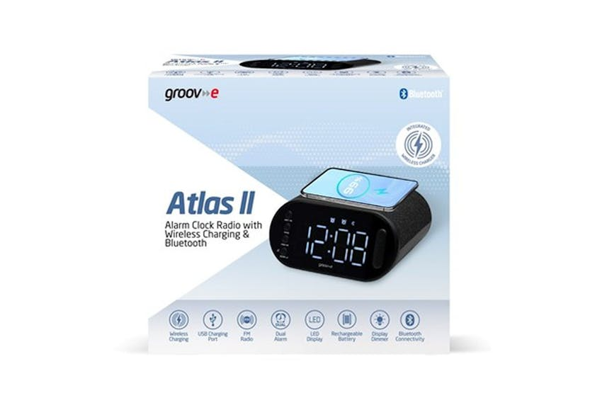 Description Online Only Wake up to the high-tech functionalities offered by the Groove Atlas II BT Alarm Clock Radio . Masterfully developed by audio innovators, GROOVE, this dynamic device integrates pioneering features into its stylish, compact form. Crafted for the modern Irish household, the Atlas II serves more than its primary purpose of timekeeping - it's an advanced bedside companion bringing audio performance and wireless charging conveniences under its thank you. Grab the dual role of morning alarm and your favourite FM radio broadcaster, the Atlas II allows you to greet the day with lively radio tunes or a classic buzzer sound. Its wireless capabilities paired with smooth Bluetooth connectivity conceive a seamless audio experience, effortlessly streaming your device's content through its powerful 5-watt speaker. Understandably, one can never have too much innovation on the bedside table - that's why the Atlas II incorporates a 15-watt wireless charger. Supporting a range of wireless-enabled devices, it assures you'll wake up to a full battery ready for the day ahead. If your device lacks wireless charging, don't worry - a dedicated 5-watt USB-A charging port and USB-C power cable have you covered. As daylight gently breaks, the clock's white LED screen comfortably adjusts with a dimmer to suit your light sensitivity. Other thoughtful details create comprehensive user control, such as a dual alarm setting, adjustable alarm volume, auto scan FM stations, and snooze functionality. Product Specifications: Alarm with FM radio or buzzer tones Bluetooth connectivity for seamless audio streaming Dual alarm setting Speaker power 5W Wireless charger 15W - compatible with a variety of devices USB-A 5W and USB-C charging ports (USB power supply not included) 1200mAh rechargeable battery 12H or 24H time modes display on a white LED screen FM radio functionality with easy auto-scan Dimmer with four-level adjustments. Required cable included for charging/powering the device Distinguished by technological dexterity and aesthetic appeal, the first-rate Groove Atlas II BT Alarm Clock Radio settles for no less than revolutionising the radio and audio landscape in Ireland - ushering in a sonorous tomorrow.