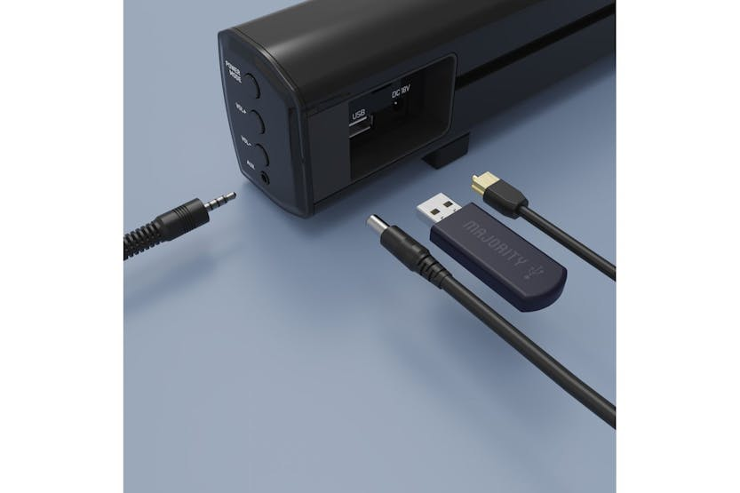 Description Online Only The MAJORITY Bow Fell Bluetooth Soundbar is a sleek companion to your home entertainment environment, amping up your audio with immersive, full-bodied sound. Crafted by the renowned electronic brand, MAJORITY, this compact soundbar speaker with built-in subwoofer promises unparalleled deep and rich sound, making your favourite TV shows, movies, and music more exciting. Despite its compact design, this soundbar takes your home entertainment experience to new auditory heights. The sleek, lightweight, and minimalist design effortlessly integrates with any modern home décor. The MAJORITY Bowfell's small footprint ensures it tucks easily under a TV or monitor without obstructing the view. It's unobtrusive but undeniably powerful – a true audio delight designed to maximise space without compromise. This multi-connection soundbar is equipped with Bluetooth, USB, AUX, Optical, & RCA Inputs, allowing for seamless audio synching with a myriad of devices. Whether you're connecting to your TV, computer, or any Bluetooth-enabled device, the Bowfell's universal adaptability makes it a versatile addition to your setup. The MAJORITY Bowfell Bluetooth Soundbar is not just about power and versatility. It also offers an optimised sound experience tailored to your needs. Choose from preset equaliser options on the remote to personalise your audio output for every occasion. Experience the visceral excitement of action films, the delicate nuances of dialogue in dramas, and the rhythmic beats of your favourite music all with perfect clarity. The built-in subwoofer provides enhanced bass, adding depth and dimension to your audio experience. This isn't just about what you hear, but what you feel – the Bowfell allows your music and movies to come to life. Specifications Model: Bowfell Bluetooth Soundbar Power: 50-Watt Dimensions: 38.8 x 5.4 x 7.2 cm Weight: 1.5 kg Features: Multi-connection Bluetooth, USB, AUX, Optical & RCA inputs, built-in subwoofer In the realm of sound bars, the MAJORITY Bowfell is a standout. It represents MAJORITY's commitment to quality, showcasing immersive sound, versatile connectivity, and sleek design. If you're an audiophile craving for compelling sound packaged in a stylish, compact unit, the MAJORITY Bowfell Bluetooth Soundbar is your clear cut choice.