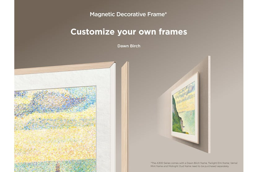 Description A300W NXTFRAME TV: Art in Form, Chic in Space Chic Style The TCL A300 Series TV advocates for a relaxed and aesthetically pleasing lifestyle. Inspired by Nature, its design brings a bright and artistic touch to home interiors, offering a relaxed and casual product experience. Flat & Slim Frame Design: Lead a Light Lifestyle 27.9mm Ultra-Slim Body*: Slim Like a Frame It resembles a masterpiece hanging on the wall, decorating your space by its slim body. *A body thickness of 27.9mm applies exclusively to 55-inch and 65-inch televisions. *The content is for reference only. The actual product (including but not limited to appearance, color, size) and screen display content may be slightly different. Please refer to the actual product. Seamless Wall Mounting*: Blend into Walls, Elevate your Decor The back of A300 Series seamlessly fits against the wall like a flat panel, as if it belongs there, minimalist but elegant. *In the event of wall surface irregularities, angles not being exact to the floor, or incorrect installation, a minor gap between the wall and the TV may be observed. Uni-Body Design: No More Need for One Connect Box The Uni-body incorporates ultra-thin components, it eliminates the need for the one connect box, bringing life back to the beauty of simplicity. Cable Management Design: Make Cables Invisible The hidden cable design on the back brings a sense of harmony to your neat space. *The Movable Floor Stand is sold separately. Magnetic Decorative Frame: Customize your Own Frames Dawn Birch Like the morning sunlight streaming through trees, warm and clear. *The A300 Series comes with a Dawn Birch frame, Twilight Elm frame and Vernal Mint frame need to be purchased separately. Vernal Mint* Like peppermint leaves swaying in clear water, fresh and soothing. Twilight Elm* Like a light mist enveloping trees in the twilight, serene and profound. Place as you Want: Seamless Wall-Mounted Slim and elegant, just like a frame on the wall. * The A300 Series comes with a Seamless Wall-Mounted, Movable Floor Stand and Adjustable Cabinet Stand are sold separately. *The content is for reference only. The actual product (including but not limited to appearance, color, size) and screen display content may be slightly different. Please refer to the actual product. Adjustable Cabinet Stand* You can place the TV on the sideboard and adjust its height as needed. Movable Floor Stand* Equipped with a movable floor stand, moves freely at home as you wish. Aesthetics Inspired by Nature Beauty: Pure Beauty Drawing inspiration from nature, TCL A300 Series integrates art into life. Fill your days with peace and joy. Luna White|New Moon|Doric Roman Pattern Luna White In the clear dusk, the crescent moon appears in a soft, warm white tone, narrating harmony and warmth in everything. New Moon On a clear evening, a crescent moon blends into the twilight, light and graceful, evoking imagination. Doric Roman Pattern Inspired by the Greek classical Doric Order, it is simple yet textured, both classical and modern, bringing cultural heritage and artistic atmosphere to A300 Series. *The content is for reference only. The actual product (including but not limited to appearance, color, size) and screen display content may be slightly different. Please refer to the actual product. Free Lifestyle: A Free-moving Lifestyle TV Movable Floor Stand*: Place Anywhere you Want, Switch your Style Intuitively Equipped with an easel-style floor stand and wheels, your TV glides freely at home, transforming every corner into your personal cinema for audiovisual enjoyment. Detachable Side Tray: Place your Favorite Decorations *Movable Floor Stand, Detachable Side Tray, Back Cover are sold separately. *The content is for reference only. The actual product (including but not limited to appearance, color, size) and screen display content may be slightly different. Please refer to the actual product. Detachable Casters: Stand or Move as you Wish Easy to Move With Just a Gentle Push: Yoga Everywhere Position your TV just right, with the morning light, follow the screen for yoga, and awaken your entire day. *This TV is lack of weather-resistant features,we advise against the prolonged outdoor deployment of the TV to maintain its optimal performance and durability. *The content is for reference only. The actual product (including but not limited to appearance, color, size) and screen display content may be slightly different. Please refer to the actual product. Enjoy Films Under the Stars* Move the TV to the balcony for a cozy night under the stars with your lovers. Create and Cast from Anywhere In your study, you can project your own work and documents onto the large screen. You can adjust the angle and position as you please. Read with your Kids Move the TV to the bedroom to narrate the stories for your child. Matte screen with anti-glare, softer light for a more comfortable viewing. Flow with Music On a leisurely weekend morning, move the TV to your bedside. With the gentle patter of rain on screen, relax and read, away from worldly noise. Enjoy your Feast by the Sea During meals, move the TV to the dining room. Enjoy the sound of waves on screen, feeling seaside romance at the table for an immersive dining experience. "AI" Art & Matte Screen: Effortless and Unlimited Inspiration "AI" Art*: Explore your Styles TCL A300 Series has more than 100,000 pre-generated AI artworks from classical style to impressionism. Just tap on the style and theme, and you get to personalize your screen to your style in seconds. *"Ai" Art images are pre-generated by AI technology, not created in real-time. *The content is for reference only. The actual product (including but not limited to appearance, color, size) and screen display content may be slightly different. Please refer to the actual product. Art Gallery: Bring the World's Art Galleries Home You can display the artworks even when the TV is off. The A300 Series would turn your home into