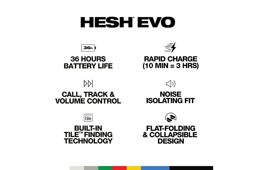 Description Sound That Will Blow You Away With powerful 40mm drivers and exceptional acoustics, Hesh Evo features audio quality that has been refined over four generations of constant improvement. The clear, rich sound rivals the most expensive headphones out there at a price that's surprisingly affordable. Check out the video: Simplicity Perfected Hesh Evo is the unrivaled everyday headphone for people who want to keep it simple. Along with outstanding sound, they're engineered with just the right amount of added features to make your life a little easier. Don't Worry, You've Got Tile Hesh Evo features built-in Tile finding technology. If you ever misplace your headphones, you can easily ring them from the Tile App. So what might have seemed lost, is now quickly found. Battery To Listen On and On We know: It's hard to remember to plug in all the devices you have in your life. That's why Hesh Evo features a long-lasting 36 hours of battery life. Plus, whenever you get low, the Rapid Charge feature gives you 3 hours of listening time on just a 10-minute charge. Easy, Convenient Controls Simple, intuitive buttons let you take calls, adjust volume and change tracks without ever touching your phone. Comfort For Hours With an ultralight headband and soft pads that fully surround your ears, Hesh Evo is one of the most comfortable headphones you'll ever put on. Go-Anywhere Design Thanks to rugged, innovative hinges that both fold flat and collapse, Hesh Evo easily goes wherever you go. Product Features: Up to 36 hours of battery Rapid charge (10 min = 3 hrs) Built-in tile finding technology Flat-folding and collapsible Call, track and volume control Noise-Isolating fit Driver diameter: 40mm