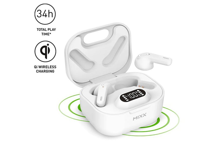 Description Touch Sensor Controls The Mixx Streambud Hybrid earbuds are true wireless earbuds with enhanced stereo sound. With 6 hours battery life on a single charge and an additional 34 hours in the charging case, you've got a total of 40 hours play time. We've designed these wireless earbuds to fit comfortably within the contours of your ear. The touch sensor controls allows you to choose your preferred EQ mode, adjust the volume and access Siri or Google Assistant. With the handy storage and charge case that has a smart digital battery display, you can store and charge on the go. Perfect for commuting and general everyday activities. Hands Free Calling Touch Controls Activate Voice Assist Quick Charge Out of charge? No problem, 15 minutes in the charge case gives you 2 hours of play time Qi Wireless Charging Wirelessly charge your portable charge case or charge by USB C cable. Digital Battery Display Check the battery status of both the charge case and each earbud with the digital display screen on the charge case. Compatibility: Apple, Android or Windows based phones, tablets and notebooks or laptops with Bluetooth audio support. Product Features: 6 Hours play time on a single charge Up to 34 hours play time with charge case - Recharge up to 6 times Charge case with digital battery display Lightweight and discreet IPX5 rated resistance to water and dust Magnetically drop and slot into the case for charging and storage Instant auto-pairing when removed from the charging case Auto power on and off Touch sensor controls to play / pause and answer calls hands free Bluetooth 5.1 Supported profiles: HSP, HFP, A2DP, AVRCP Wireless range: 10 metres Battery life (earbuds): 6 hours / With charging case: Up to 34 hours Frequency response: 20Hz-20kHz Battery capacity: 40mAh/side / Charging case capacity: 300mAh Standby time: Up to 120 days Weight: StreamBuds Hybrid 9g / StreamBuds Hybrid in charging case 60g Read More