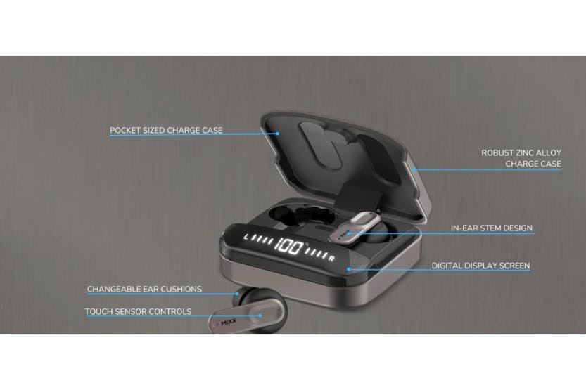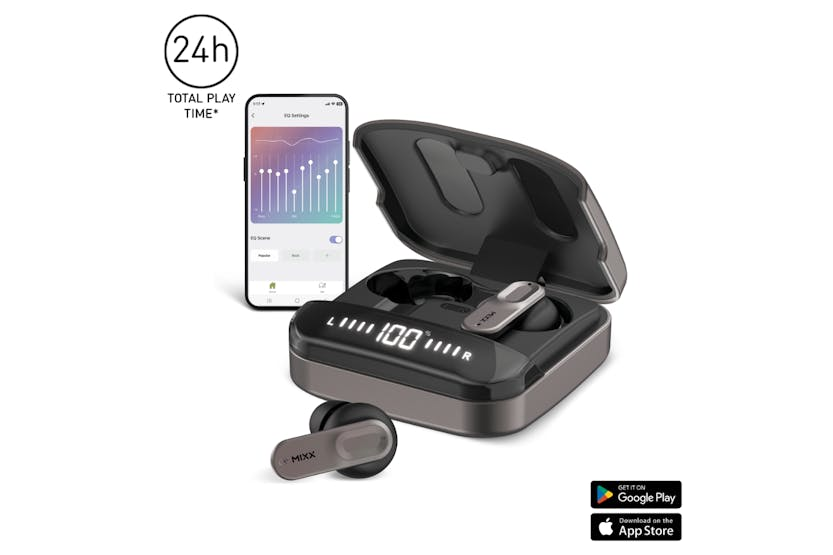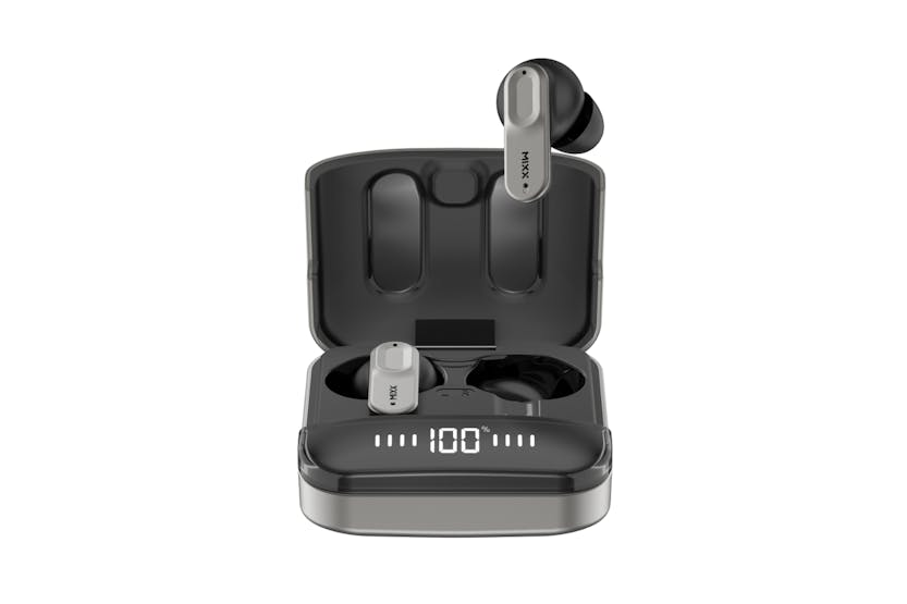 Description Enjoy enhanced audio clarity and convenience with the Mixx Streambuds Ultra Mini True Wireless Earbuds. The robust zinc alloy charge case and silicone ear cushions (small, medium, and large) provide ultimate comfort and stability, while the digital display screen ensures you always know how much power you have left. Touch sensor controls and hands-free calling make them a breeze to use, and the Mixx Control App lets you customise sound settings for an even more personalised experience. With six hours of battery life on a single charge and 24 hours of total play time with the charge case, you have hours of entertainment with a simple 15-minute quick charge to top you back up. Mixx Control App Customise your earbuds with the MIXX Control App, create personal EQ settings as well as customise the touch controls. Clear Voice ‘Beam-forming’ technology is used to focus 4 built-in microphones which pick up more of your voice and less of the surrounding noise, making your phone calls sound much clearer. Quick Charge Out of charge? No problem, 15 minutes in the charge case gives you 2 hours of play time. Product Features: Robust zinc alloy charge case Customise sound settings with the mixx control app Touch sensor controls - play, pause and more Digital display screen showing battery Hands free calling 6 Hours battery time on single charge 24 Hours total play time with charge case 15 Minute quick charge - 15 mins = 2hours of play time