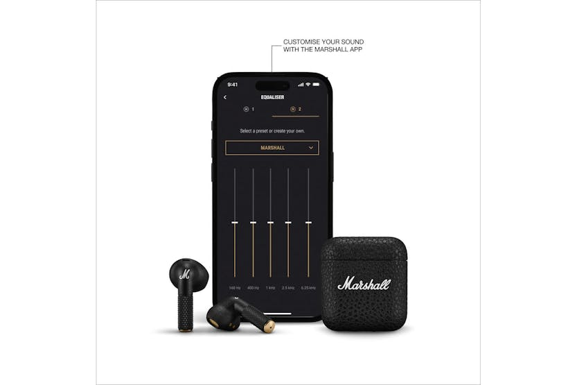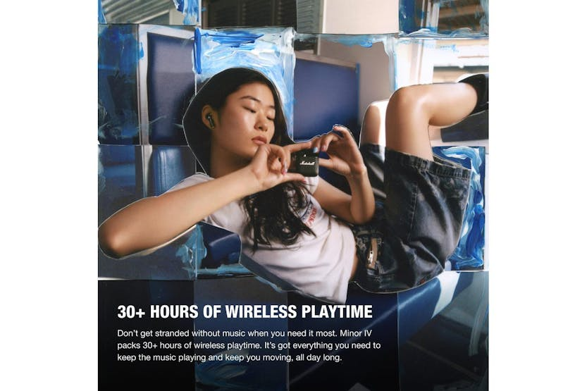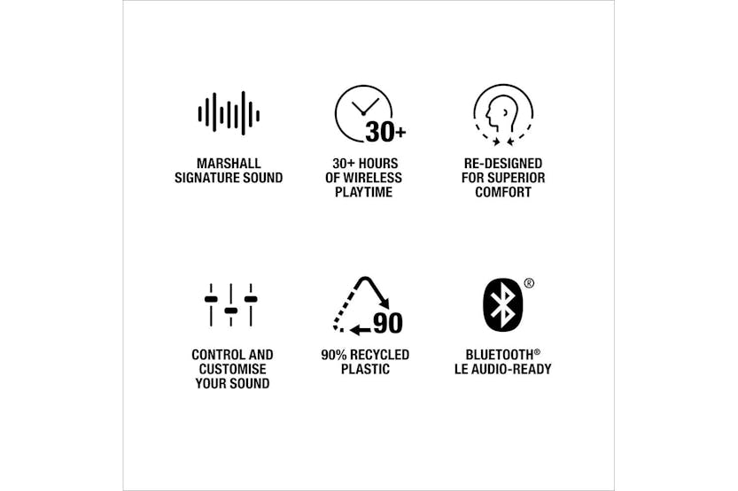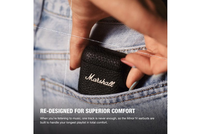 Description Online Only Check out the video: The MARSHALL 1006653 - Minor IV True Wireless earbuds, in signature black, are designed with your active, on-the-go lifestyle and your music listening expectations in mind. Engineered for ultimate comfort with their intuitive, lightweight design, and armed with advanced features such as EQ settings extensively customizable via the Marshall Bluetooth App, these earbuds provide a seamless, personalised listening experience. Unvarying from Marshall's champion sound, the Minor IV sports earbuds present an acoustically tuned sound that commands attention in any setting. Enjoy your favourite anthems, podcasts, or phone calls, all with an impressive 30+ hours of wireless playtime, thanks to the high-capacity charging case. The earbuds hold up to 7 hours of wireless playtime on their own. When you need an extra boost, slip the earbuds into the charging case, ready-to-go for your next music session. In line with the high-quality sound is the digital-ready advancements of these headphones. Benefit from the upcoming Bluetooth LE audio technology, which promises higher audio quality, extended streaming range and better audio sync. Listening to music just became more exciting, as you now can connect to multiple devices simultaneously, thanks to Bluetooth multipoint connectivity. The Minor IV Wireless headphones are designed for comfort, featuring a re-designed earbud and stem angled to fit naturally inside the ear canal. They are also water-resistant, so a little rain wont dampen your listening experience. Backed by an innovative battery preservation feature, accessed via in-app controls, these earbuds ensure your battery ages slower, thus increasing the lifespan of your device. Furthermore, this product is manufactured using 90% post-consumer recycled plastics an excellent reflection of sustainable innovation. Be it CDs, washing machines or electric bicycles; the plastic from everyday preloved products is utilised in the manufacturing of these earbuds, strengthening our commitment to green initiatives and fostering a healthier environment. Product Specifications: Driver Type: Dynamic Driver Impedance: 32 ? Frequency Range: 2020,000 Hz Drivers: 12 mm Play Time: 7 hours in earbuds, 30+ total hours with case Battery Preservation: Yes Wireless Charging: Yes Quick Charging: 15 minutes for 3 hours playtime Controls: Music control, Call handling, Volume adjustment, Voice assistant, EQ Preset Wireless Connectivity: LE Audio-ready Weight: 7.39 g (0.26 oz) Water Resistance: IPX4 (earbuds only) Colour: Black What's in the Box: Minor IV True Wireless Headphones Charging Case USB-C Charging Cable User Manual, Legal, and Safety Information