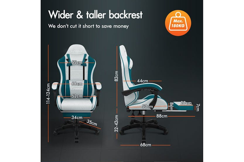 Description Online Only - Free Delivery Multiple Uses Choose Elfordson, the Best Resolution Ergonomically Designed Thor Series 2-point Lumbar Massage 150° Backrest Recliner Dynamic Ergonomics Reinforced Steel Base SGS-safe Gas Lift Nylon Base with Quality Wheels Integrated 2- Point Massage Enjoy soothing. This high back gaming chair provides USB-powered vibration massage in adjustable & removable lumbar cushion, it helps alleviate back tension, enhancing comfort during gaming, work, or study sessions. Posture-Perfect & Cool Comfort This ergonomic computer PC chair features an engineered frame aligned with your spine's natural curve, personalising your comfort with adjustable headrest and lumbar support. The generous seat is padded with high resilience foam, providing excellent body support while reducing pressure points on hips and thighs during extended use. Breathable fabric linen ensures optimal airflow. Flexible As you Need With 10cm of height adjustment, this gaming chair comfortably accommodates children, teenagers, and adults. The linkage armrests move along with the reclining backrest (90°-150°), ensuring continuous arm support whether gaming, working, or resting. Retractable footrest enhances relaxation, while 360° swivel and multi-directional silent casters enable smooth movement. This PC chair allows you to move effortlessly at home, office, or e-sports playroom. Vibrant & Premium 6 colour options available for various decoration styles. Crafted with TUV-certified casters, solid streamlined nylon base, and an SGS-approved gas lift mechanism with over 120,000 tests. This computer desk chair accommodates users up to 180kg (400 lb), deliverig ultra stability and safety. Product Features Frame material: Engineered wood Back style: Cushion back Adjustable lumbar Adjustable height Arm rest Ergonomic Head support Read More
