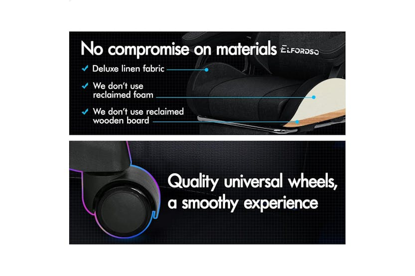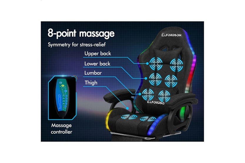 Description Online Only - Free Delivery ELFORDSON LED & Massage Gaming Chair Fabric Collection LED chairs are cool gaming chairs that can help you stand out from the gaming crowd. Elfordson supreme LED & massage gaming office chair is born for serious gamer, and the smart working executive who loves the adrenaline of residing in a gaming chair. Elfordson all-metal frame racer chair is the ultimate for movers and shakers like yourself. Crafted with innovation in mind, we upgraded the gaming chair with 12 colours of LED and 8 massage points (while old models only equips with 7 LED & 7 massage points), making the gaming experience more comfortable and enjoyable. That means aside from looking good with more terrific customisable LED lighting effect, the chair also provides a better massage while enjoying your favorite game. Furthermore, its ergonomic S-curve design with detachable and height-adjustable lumbar and neck cushions offers perfect support to make you relaxed, allowing you to work or play at your peak for long periods of time in optimal comfort. Combined with retractable padded footrest that suits your personalized positions while sitting, sleeping or playing games. An elite in quality and design, your solution to true comfort. It features 150 degree back recline adjustment and 360 degree swivel, you can lock the position of reclination as you wish. Upholstery crafted with premium linen fabric and generous foam paddings ensures optimal durability and easy cleaning. A stylish nylon base with TUV certified casters, Intertek approved linen fabric, SGS approved Gas-Lift system and tilt function, delivering absolute five star luxury. And unlike some other sellers, we have no compromise on materials used. We guarantee that no cycled foams are used, no backrest is cut short or narrow to save money, and no seat foam is cut thin to save cost. The Elfordson range is available in multiple colours and designs, browse Elfordson store and choose one that best suits you or your room. Take the stress out of work and experience superior comfort at your desk - order your Elfordson gaming office chair today! Specifications Intertek approved supreme linen fabric SGS approved gas-lift, no worries about explosion TUV approved caster wheels Triple-layer seat: linen fabric + resilience foam + robust wooden board High weight capacity: 180kg Colour: Black What's in the Box: 1 x Elfordson office chair 1 x Assembly manual Product Features: Customisable 12 colours RGB LED light You can customize light emitting area: backrest only or backrest & seat 300 lighting effects with remote control 8-point massage & 5 massage modes with massage controller Upgraded slide rail armrests Heavy-duty all-metal frame racer Dynamic ergonomics design, best fit for your body Removable and height-adjustable head & lumbar cushions Extra large lumbar pillow for better support! No compromise on materials, we don't use recycled foam Generous foam paddings, we don't cut it thin to save money Up to 150 degree back recline adjustment Able to lock the reclination position Wider & taller backrest, we don't cut it short to save cost Retractable padded footrest Premium universal wheels, a smoothy experience Deluxe tilt adjustment Whole-piece moulding foam, better weight distribution and support Smoothly 360 degree swivel Deluxe PP plastic armrests with padding, wide and supportive High resilience foam in car-seat grade Eliminates back and shoulder pressure Sporty nylon base with a touch of matching colour Ideal for gamer and business uses