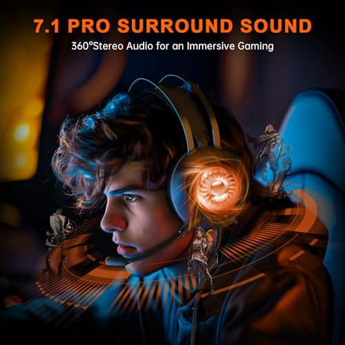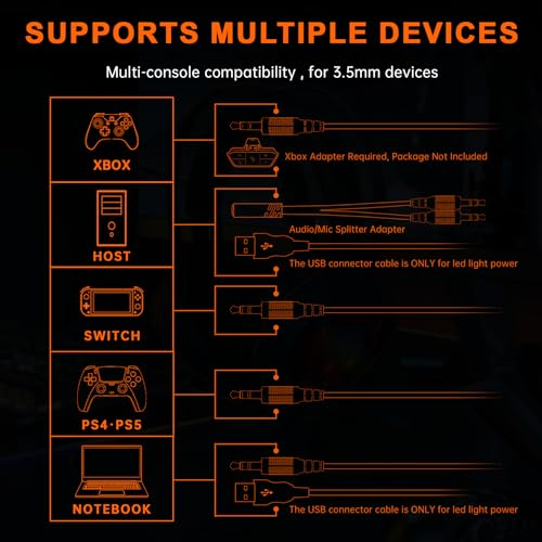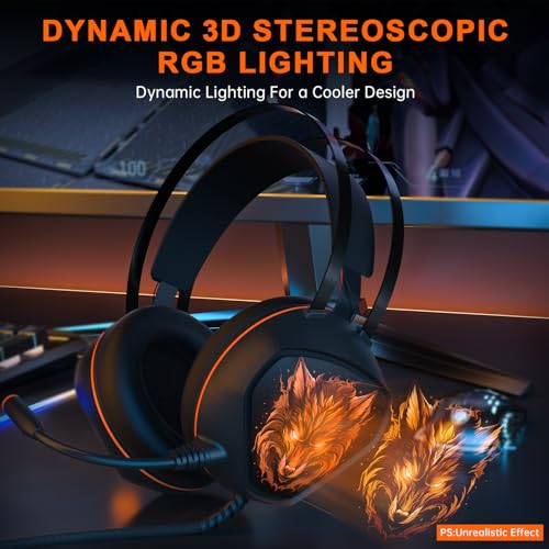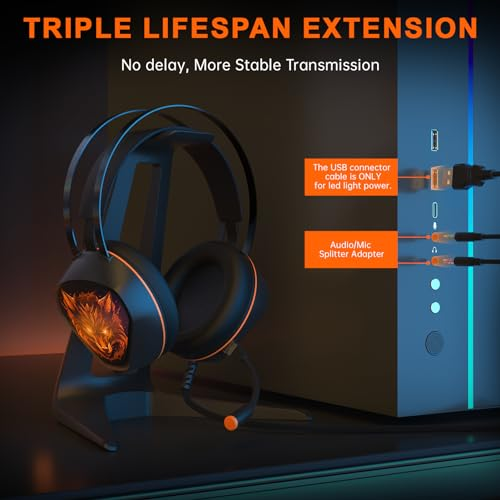 About this item The CM7000 gaming headset with microphone features an innovative dynamic RGB lighting setup, enhancing its aesthetic appeal. The dynamic rotation of the RGB lights accentuates the distinctive style and features of these Xbox headphones, elevating their visual impact. This sophisticated lighting design imbues the wolf motifs on the sides of these headphones with higher realism, thus enriching your immersion in the game with a truly distinctive experience. This gaming headset features an omnidirectional noise-cancelling microphone that significantly decreases ambient noise during gamer team communications, improving speech up to 44 ((((0%. In addition, the CM7000 gaming headset with microphone features a convenient one-click mute button, making quick adjustments for muting in unforeseen circumstances. 【7.1" & 】: Equipped with 50mm high-precision magnetic neodymium drivers, NdFeb magnetic baiter and PET grade diaphragm, this headset delivers 7.1 surround sound for an immersive gaming experience. Provides 40% improved stereo sound quality compared to previous generation, ensuring smooth equipment communication. This Xbox headset with microphone allows you to clearly detect directional audio, steps, and intricate details in games, creating a more realistic and immersive gaming environment. syndesmos xbox gaming headset features a self-adjusting double-head beam design, which can adapt to your head shape without manual intervention. More importantly, this PS5 headset with microphone weighs only 270G, significantly relieves head pressure during prolonged use, making it 40% more comfortable than comparable products. Faux leather earmuffs 1.5 times larger than standard ones, ensuring a better fit for most people's ears. The CM7000 Xbox headset features a 7-foot high tensile strength braided USB cable. It is widely compatible with xbox-1 series X/s controller, PS5, PS4, switch, etc. This Xbox headset fits any PC or mobile device with a 3.5mm jack. Our team has been in the gaming headset industry for over 15 years, with first-class production lines and senior technical support. We support 24/7 online consulting service to provide you with peace of mind 1:If the microphone does not work when using for the first time, please check whether the microphone button is muted. If so, please change the "microphone button" to the unmuted state so that the microphone can work normally. Otherwise, please contact us as soon as possible for after-sales service. 2:Please note that you need an extra Xbox adapter(the package not included) when connecting with an x-box controller 1 previous version. If you need the adapter, please buy it separately. If you have an Xbox adapter, please make sure the adapter is well connected to the controller or the headset has static sound. 3:When using headphones on your PC, please make sure to connect the "1 to 2 3.5mm audio splitter cable (microphone red, green-audio). Only when your devices have a USB port, the RGB lights can light up. The USB connector cable is for LED light power only. › See more product details