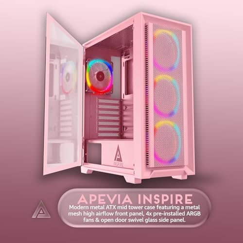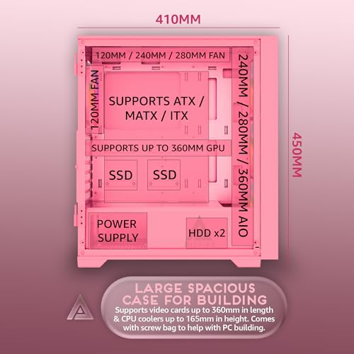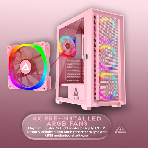 About this item Performance gaming mid tower with left-side tempered glass door swivel open style magnetic side panel & metal mesh high airflow front panel with 134 total vents on the sides. Plenty of room on the back side to hide and route cables. Matching paint colors from both the exterior/interior of the case & case fans. 4x 120mm ARGB fans pre-installed in case, comes with 3pin ARGB connector on RGB fans for ARGB motherboard sync (Only compatible with ARGB motherboards). RGB fans has 366 RGB lighting modes via RGB light switch button on top of case (Press down on LED button for 5 seconds to switch to motherboard ARGB sync mode) Can fit graphics cards up to 360mm in length and CPU coolers up to 165mm in height. Top panel comes with 2 x USB 3.0 & HD Audio jacks. Front panel water cooling options: 120mm, 240mm, 280mm, 360mm / Rear panel water cooling options: 120mm Screw in PCI-E Slots (Non-punch out PCI-E Slots) for hassle free GPU installation. Room for up to 2 x 2.5" hard drives and 2 x 3.5" hard drives Magnetic Dust Filter on the top panel for reducing dust falling into case. Easy to remove dust filter to wash/clean › See more product details