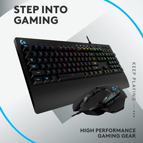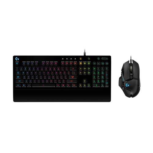About this item Step into gaming with G502 HERO RGB Gaming Mouse and G213 Prodigy Gaming Keyboard: your winning gaming keyboard and mouse combo with customisable LIGHTSYNC RGB and gaming grade performance Programmable RGB Lighting and Lightsync technology: Customise lighting from nearly 16.8 million colours; sync your gaming keyboard and mouse together and with other Logitech G gear (1) Gaming-grade mouse: G502 HERO features HERO 25K sensor with 1:1 tracking and 100 - 25,600 max dpi range; 11 programmable buttons (1); five 3.6g weights for tunable configurations Gaming-grade keyboard: G213 Prodigy full-size keyboard features tactile mech-dome keys for fast and responsive feedback; anti-ghosting gaming matrix for optimal gaming control Gameproof Keyboard: G213 wired keyboard is durable and spill-resistant (2) with integrated palm rest and adjustable feet; dedicated media controls - play, pause and mute at your fingertips Programmable via G HUB: Customise LIGHTSYNC RGB lighting and mouse buttons via Logitech G HUB software to match your style and space; assign time-saving macros to your gaming profiles › See more product details
