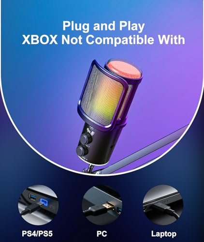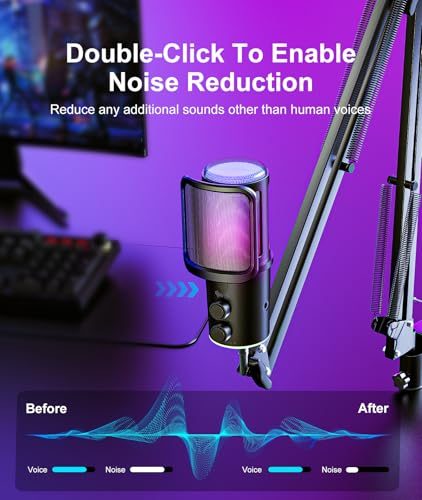 About this item đď¸ ăStudio-Level Clarity & Smart Noise CancellationăExperience pro-grade sound! Our advanced capacitive capsule captures every vocal detail with precision. Instantly activate advanced noise reduction to eliminate background noise like keyboard clicks and fan soundsâperfect for intense gaming comms or late-night meetings. Your voice stays crisp, clear, and full of impact. đ ăDynamic RGB Lighting â Set the MoodăCustomize your stream aesthetic! easily adjust colors and lighting effects via the dedicated control knob. Captivate your audience, energize your content, and make this mic the centerpiece of your streaming vibe. âď¸ă Intuitive Control at Your FingertipsăMute/unmute instantly with the tactile knobâideal for private chats or avoiding interruptions mid-game. Prevent distortion and balance volume levels effortlessly. Get consistently clean audio for streaming, recording, or calls. Sound professional every time you speak. đ§ ăProfessional Full Kit â Ready to PerformăEverything you need right out of the box! Includes a sturdy boom arm with smooth adjustability and a desk clamp for secure placement. Maximize your space when not in use. The built-in shock mount reduces vibration noise, and the removable pop filter minimizes plosives (like âPâ sounds) and breath noiseâfor warm, broadcast-ready audio. đ ăPlug & Play â Universal CompatibilityăConnect in seconds with USBâno drivers needed. Works seamlessly with Windows, macOS, and PS4/PS5. Ideal for in-game communication (Discord/TeamSpeak), HD streaming (Twitch/YouTube), podcasts, voiceovers, online meetings, and music. âş See more product details