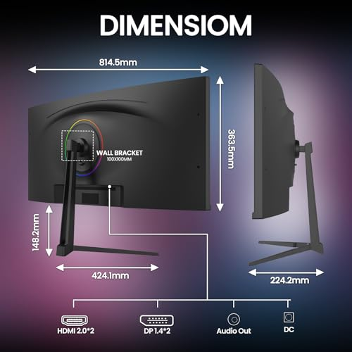 About this item 34" Curved Gaming Monitor - The 34" ultra-wide monitor features a WQHD resolution of 3440 x 1440 curvature 1900R and a 178° wide viewing angle design, offering a wide field of view that draws you into the action. Ultra-wide display offers deep contrast and expanded workspace, ideal for immersive gaming, multitasking, or cinematic media consumption 120Hz Refresh Rate & AMD FreeSync - With a 120Hz refresh rate and AMD FreeSync support, this PC monitor delivers ultra-smooth visuals with reduced screen tearing and input lag. It is ideal for fast-paced gaming, ensuring smooth transitions and responsive control for a smooth user experience DCI-P3 98% & IPS Display: Premium IPS display offers wide 178° viewing angles and exceptional color consistency. With 130% sRGB and 98% DCI-P3 coverage, 350cd/m² brightness and 2000:1 contrast, it delivers rich, realistic images and smooth gradients, ideal for color-critical tasks such as graphic design, photo editing and content creation. Built-in blue light filter ensures eye comfort during long sessions FLEXIBLE SETUP WITH HDMI, DP & WALL MOUNT SUPPORT - Equipped with HDMI 2.0, DP 1.4 interfaces and a 3.5mm audio port (connected to play audio, no built-in speakers), this portable monitor ensures versatile connectivity for your PC, console or workstation. 100mm x 100mm wall mount compatible design allows for flexible installation on walls or arms, perfect for clean setups, gaming desks or studio environments Guarantees: We offer high quality computer monitors and premium services. If you have any questions, you can contact us at any time, we are here to serve you and solve all your problems › See more product details
