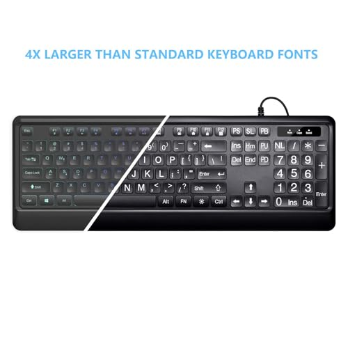 About this item 【Large Print Keyboard】- 4X larger than standard keyboard fonts, clear and easy to find, and can really help those who have trouble seeing keyboards. Perfect for elderly, the visually impaired, schools, special needs departments and libraries, etc 【White LED Backlight】- Bright and evenly distributed backlit keys, easy typing in lower light environment. Ideal for studio work, office. Backlit can choose to turn on/off and adjust brightness. 【Full Size & Ergonomics Design】- Unfold the feet at back of the keyboard to reduce hand fatigue and enjoy long hours of playing. Full QWERTY English (US) 104 key keyboard layout with numeric keypad, Large Print keys provides superior comfort without forcing you to relearn how to type. 【Plug and Play & Wide Compatibility】 - This USB keyboard takes away the hassle of power charging or swapping out batteries and is easy to setup. No drivers required.Compatible with Windows 2000/XP/7/8/10, Vista,Raspberry Pi 3/4, Mac OS(Note: Multimedia keys may not fully compatible with Mac, OS System).Works with your PC, laptop. 【Spill-proof】- This durable keyboard features a spill-resistant design. So you don't have to worry about spilling coffee and water. Enjoy Keys life of more than 5000W times. › See more product details