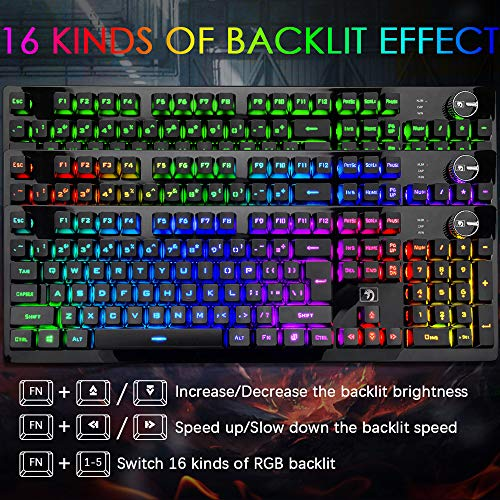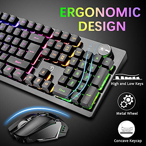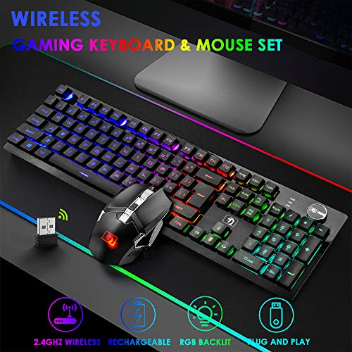 About this item 【Wireless Keyboard and Mouse Gaming】The wireless rechargeable keyboard has 16 kinds of cool RGB backlit, allowing you to add more fun in the process of typing and gaming. One-button VR knob control and 12 multimedia keys make the operation easier and can quickly access the desired objects. Two-color injection-molded keycaps enhance the transparency of the characters and the characters are illuminated, making the LED backlit effect of the keyboard clearer. 【2.4GHz Wireless Connection】The gaming keyboard and mouse combo set adopts 2.4GHz wireless connection technology and has a receiving range of 10 meters, so you don’t have to worry about too many cables or too messy. And the keyboard and mouse share a USB receiver, directly plug into the USB interface of the computer to automatically pair and use, without downloading the driver software, plug and play. (Note: The USB receiver is behind the mouse) 【Rechargeable Keyboard and Mouse Set】Both the wireless keyboard and mouse are rechargeable, with a built-in large-capacity built-in battery, which can last for a long time, save energy and quickly charge. The maximum capacity of the wireless mouse is 800mAh, and the maximum capacity of the keyboard is 4000mAh. When the keyboard does not work within 2-3 minutes, it will automatically enter the sleep mode, and press any key to resume. 【Wireless Backlit Mouse】The wireless gaming mouse has a 7-color rainbow LED breathing backlit. The colorful backlit is full of mysterious atmosphere and sense of technology; the mouse has 4 levels of adjustable DPI, up to 2400DPI, made of high-quality ABS material, strong and durable, feel comfortable. The high-precision sensor can provide precise positioning, the response speed is extremely fast, and you can quickly enter the cool gaming atmosphere. 【Ergonomic Design】The ergonomic keyboard and mouse are perfect choices for games and office. The high and low key layout of the keyboard and the concave fingertip design of the keycap and mouse can effectively reduce hand fatigue. The floating keycap design brings you the feel of a mechanical keyboard.*Tips:The keyboard is US layout.(QWERTY) 【Troubleshooting】If the buttons are slow to respond or malfunction, it may be because the battery is low and needs to be charged in time. When charging, it is recommended to connect directly to the computer USB port for charging. Do not use a fast charging charger, otherwise it is easy to damage the battery. By the way, if there are any problems, we will do our best to solve them for you. › See more product details