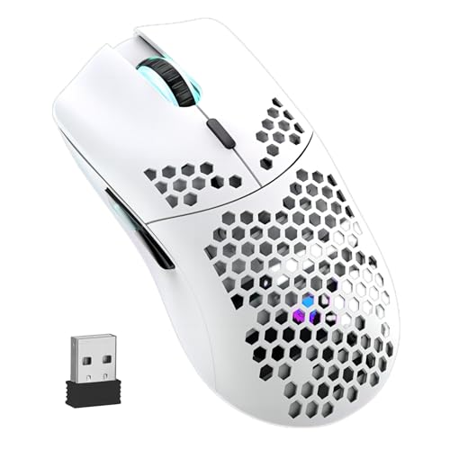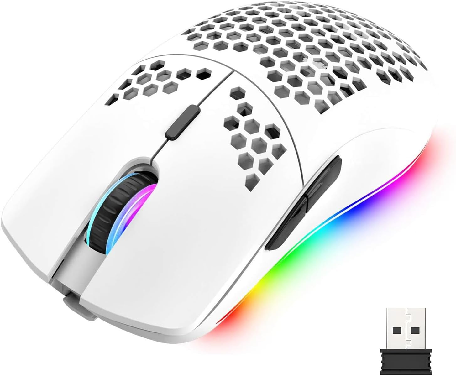 About this item 🖱️️【Lightweight Honeycomb Design】This gaming mouse weighs only 65g(2.3oz). Your hand will not feel tired even if you play for a long time. No worry about the dust and spillage will hurt the sensor, housing cover protects your mouse well and easy to clean. 🖱️【Comfortable Ergonomic Shape】The appearance of the game mice is ergonomically designed to fit your right hand, and the frosted painting surface makes it more comfortable to grip. 🖱️【Brilliant RGB Lighting】Up to 6 lighting modes let the mouse show your style with endless possibilities like dynamic streaming, breathing, glowing, and more, creating a competitive gaming atmosphere. Light up your way to victory. 🖱️【Adjustable DPI up to 3200】The wireless mouse is equipped with 5 DPI levels (600/1000/1600/2400/3200), which can register your mouse movements with pinpoint accuracy. You can switch to your DPI settings on the fly. 🖱️【Wide Compatibility】Wide compatible with Windows 7/8/10/XP, Vista, Mac OS X 10.10 and more. Suitable for all kinds of Type-C devices, tablets, smartphones, MacBooks, Chromebooks, and more. › See more product details