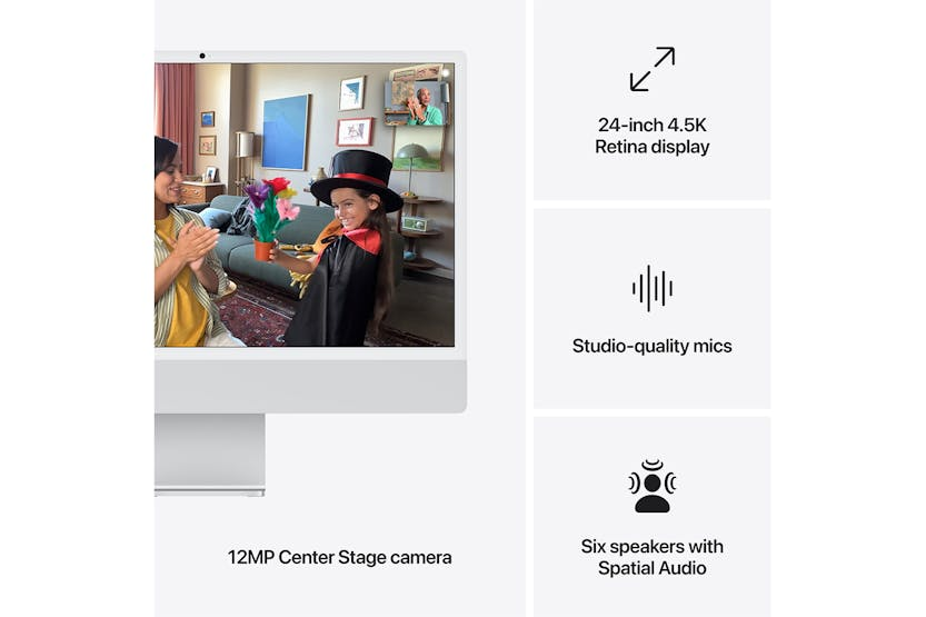 Description Key Feature Bullets (with Apple Intelligence) Fits Perfectly in Your Space The all-in-one desktop design is strikingly thin, comes in seven vibrant colours and elevates any space with style. Built for Apple Intelligence [1] Apple Intelligence is the personal intelligence system that helps you write, express yourself and get things done effortlessly. With groundbreaking privacy protections, it gives you peace of mind that no one else can access your data - not even Apple. Supercharged by M4 Get more done faster with the Apple M4 chip. From editing photos to creating presentations to gaming, you’ll fly through work and play. Immersive Display The 24-inch 4.5K Retina display [2] features 500 nits of brightness and supports up to one billion colours. Advanced Camera and Audio Stay perfectly framed and sound great with a 12MP Center Stage camera, three studio-quality mics and six speakers with Spatial Audio. Apps Fly with Apple Silicon [3] All your favourites, including Microsoft Excel, Adobe Photoshop and Zoom, run lightning fast in macOS. If You Love iPhone, You’ll Love Mac Mac works like magic with your other Apple devices. Copy something on iPhone and paste it on Mac. Send texts with Messages or use your Mac to make and answer FaceTime calls. [4] Connect it All iMac features up to four Thunderbolt 4 ports — expanding your accessory options and enabling lightning-fast data transfers. Connect up to two external 6K displays for a vast canvas to view your work. And enjoy seamless connectivity with Wi-Fi 6E and Bluetooth 5.3. [5] Privacy and Security are Built Right in Every Mac comes with robust defences against viruses and malware. If your Mac is lost or stolen, Find My can help you get it back. FileVault makes sure your files are encrypted so others cannot access them. And free security updates help keep your Mac protected. Legal (with Apple Intelligence) Configurable options are available. iMac colour availability may vary. Nano-texture availability may vary. 1. Apple Intelligence is available in beta on all Mac models with M1 and later, with Siri and device language set to US English, as a macOS Sequoia update. English (Australia, Canada, New Zealand, South Africa, UK) language support available this December. Some features and support for additional languages, like Chinese, English (India, Singapore), French, German, Italian, Japanese, Korean, Portuguese, Spanish, Vietnamese and others, will be coming over the course of the next year. 2. Actual diagonal screen size is 23.5 inches. 3. Apps are available on the App Store. Software and content may be sold separately. Title availability is subject to change. 4. FaceTime is not available in all countries or regions. 5. Wi‑Fi 6E available in countries and regions where supported. Technical Specifications Go to apple.com/ie/imac for a complete set.