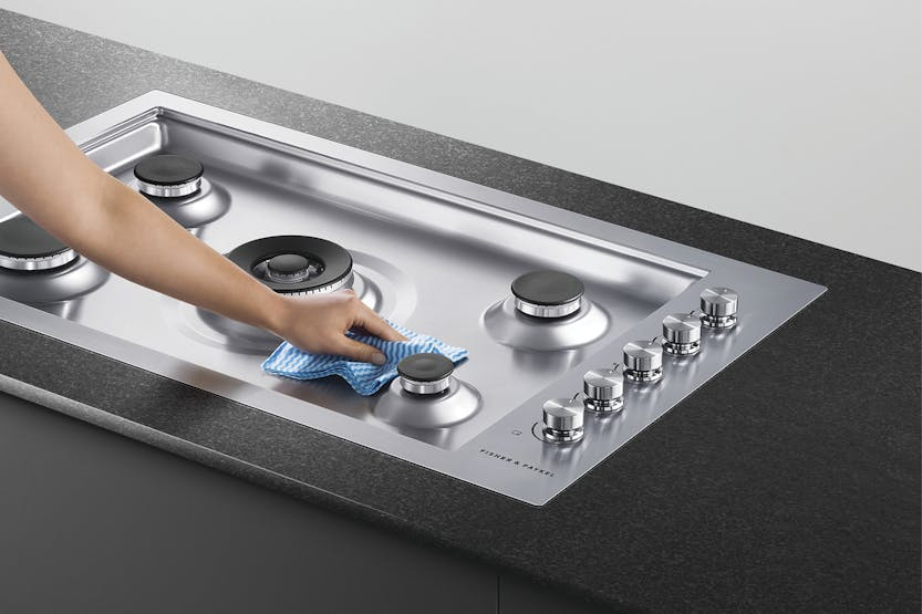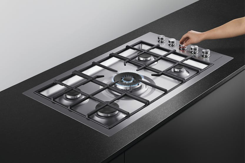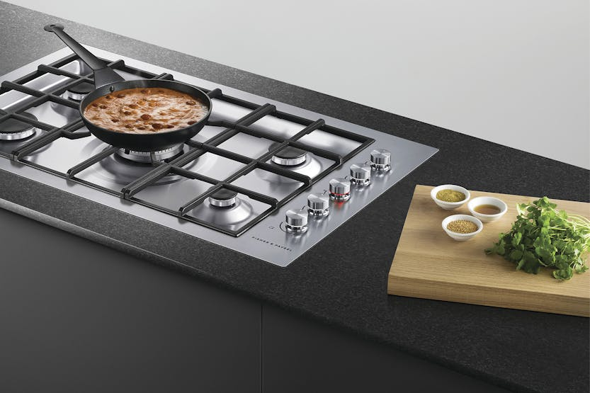 Description Extended Range Item | Available by Special Order Only Delivery expectation: approximately 1 weeks, however this time may vary This item is available by special order only and is not stocked in stores. Purchase online today to secure your product and we will be in contact with delivery estimates. For more information please feel free to contact us using the Ask Us tab. Fits Flush This Gas Cooktop’s burners are recessed into the work surface leaving the trivets flush and providing an integrated kitchen bench with a seamless look. Clever Cooking Results The consistent flame and heat distribution of the dual flame wok burner combined with the highly responsive dials offer precise heat adjustment that can perfect a slow simmer for sauces or an intense heat for searing steaks. Complementary Design The brushed stainless steel has been designed for durability but also provides a modern, stylish finish, matching the Fisher and Paykel family of kitchen appliances. Safe and Sound Intuitive dials glow red for on and white for off, showing from a distance which burners are lit. The flame failure safety device automatically turns off the gas if the flame is accidentally extinguished. Easy Cleaning The stainless steel component is easily accessible and quick to clean. Cast iron trivets provide a durable and stable cooking platform. Their rubber feet prevent them from scratching the cooktop. Handy Accessories This cooktop comes with a small pan support and wok stand to complement different cooking styles. Product Features: Cast iron trivets Dual wok control Electronic ignition Laser etched graphics Burner indicator lights Flame failure system Quick connect gas valves Quick component removal Easy clean cooktop design Turned stainless dials with illuminated halos