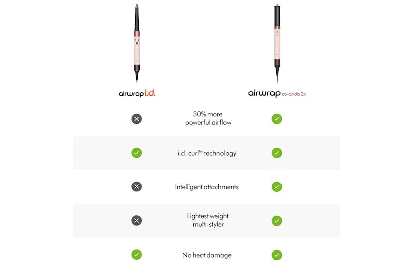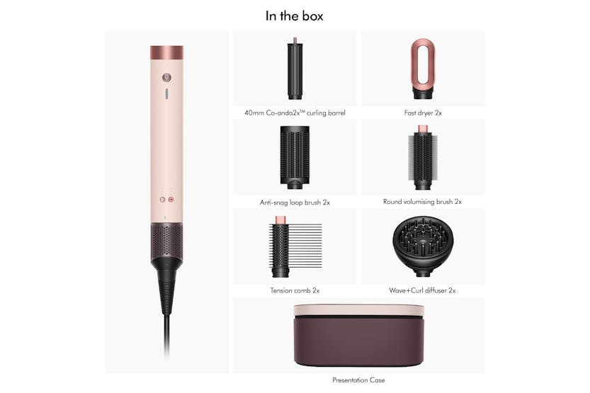 Description Next-level multi-styler with twice the air pressure for even more power! Better curling. Faster drying. Straighter styles .1 2x the air pressure with the Dyson Hyperdymium™ 2 motor. Dyson’s most powerful Airwrap™ multi-styler. New Intelligent attachments Each attachment automatically adjusts to your go-to styling preferences. Our lightest Airwrap™ multi-styler Lighter in hand, for improved control and manoeuvrability.. One-touch i.d. curl™ sequence With Bluetooth® wireless technology to intelligently adapt heat, airflow and timings to your hair type. Perfect curls at the touch of a button Create your i.d. curl™ personalised curling sequence in the MyDysonᵀᴹ app. 6-in-1 versatility Dry, curl, wave, straighten, smooth and volumise with our new Intelligent attachments. 40mm Co-anda2x™ curling barrel Increased Coanda airflow for easier styling. Over 80% said hair feels soft and looks healthy. Fast dryer 2x Controls higher velocity airflow, for full hair dryer performance. Round volumising brush 2x New tapered design allows the whole bristle to pivot, releasing hair easily as you style. AirSmooth2x™ attachment Straighter styles, no hot plates. 91% said hair looks healthy. 81% said hair is frizz free. Anti-snag loop brush 2x For a smoother, more aligned finish. Over 90% said hair is tangle-free, and bristles were comfortable. Key controls Power and Cold shot buttons Press the Power button to activate airflow, initiate automatic features and turn off the device. Hold the Cold shot button to deactivate the heating element and set your style. Airflow speed and temperature control For each attachment, you can change the heat and airflow from the preset setting, to suit your needs. The device remembers and intelligently adjusts to your go-to styling settings. In the box: New Dyson Airwrap Co-anda2x™ multi-styler and dryer - Straight+Wavy (Ceramic pink/Rose gold) 30mm Co-anda2x™ curling barrel 40mm Co-anda2x™ curling barrel AirSmooth2x™ attachment Anti-snag loop brush 2x Round volumising brush 2x Fast dryer 2x