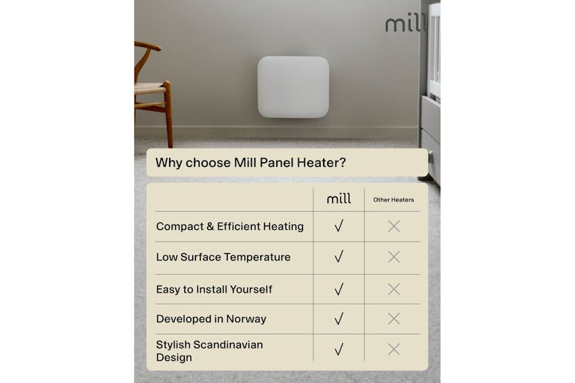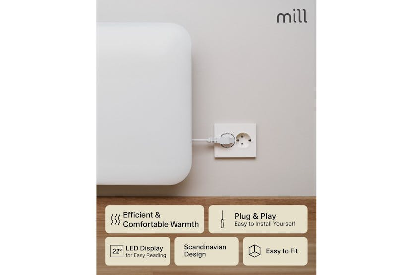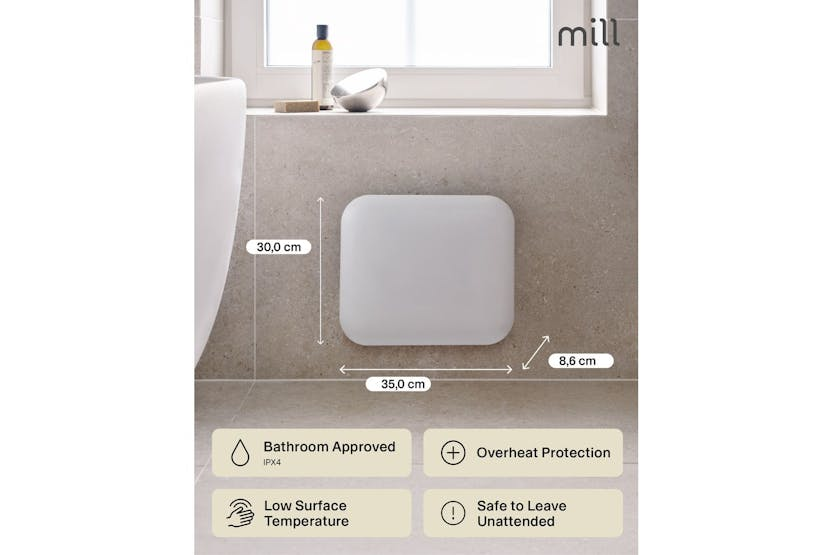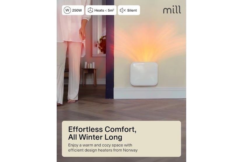 Description ONLINE ONLY Invisible Panel Heater 250W | Electric Heater | White | Small Room Experience the perfect blend of Scandinavian style and practical comfort with the Millheating Invisible Panel Heater 250W. Specially designed for Irish homes, this compact electric heater is the ideal solution for adding discreet, efficient warmth to small spaces such as bathrooms, hallways, or guest bedrooms. Its slim, minimalistic profile and softly rounded corners ensure it fits seamlessly into any modern interior, while the crisp white finish complements a wide range of décor styles. Engineered in Norway, the Mill Invisible Panel Heater 250W is built for both performance and safety. The advanced X-aluminium heating element delivers fast, even heat distribution, ensuring your room reaches the perfect temperature quickly and quietly. With a low surface temperature and silent operation, this heater is safe to leave unattended, making it perfect for overnight use or busy family homes. The integrated electronic thermostat and clear LED display allow for precise temperature control, so you can enjoy effortless comfort at the touch of a button. Installation is a breeze thanks to the included wall bracket and screws, and the compact design means it will not take up valuable floor space. Approved for bathroom use with an IPX4 rating, this heater is as versatile as it is stylish. Whether you are looking to warm a small bathroom, keep a hallway cosy, or add a touch of comfort to a guest room, the Millheating Invisible Panel Heater 250W is the smart, energy-efficient choice for Irish households. Enjoy peace of mind with built-in overheat protection and a generous 5-year warranty, ensuring reliable performance for years to come. Choose the Mill Invisible Panel Heater 250W for a safe, silent, and stylish heating solution that fits perfectly into your life. What's in the Box Wall bracket and screws Product Features Silent operation with low surface temperature for safety Advanced X-aluminium heating element for fast, even warmth IPX4 bathroom approved – safe for use in wet areas Designed in Norway with a sleek, minimalistic look Easy wall installation – bracket and screws included Safe to leave unattended, perfect for overnight use Model: IB250 Power: 250W Recommended room size: 2-5 m² Thermostat: Electronic LED Display: Yes Heating Element: X-aluminium IP Rating: IPX4 (bathroom safe) Max Surface Temperature: 62°C Colour: White Dimensions: 35.0 x 30.0 x 8.6 cm Cord Length: 130 cm (right side