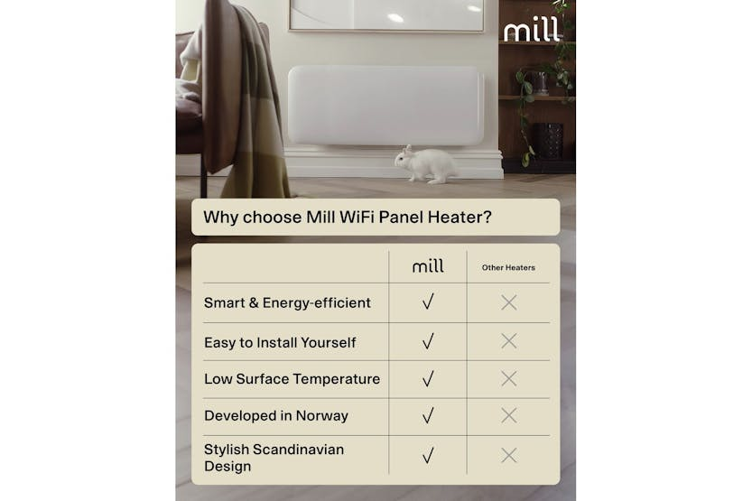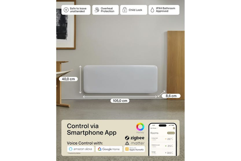Description ONLINE ONLY Invisible Smart WiFi Panel Heater 1300W | Panel Heater | White | 105x40cm Experience the next level of home comfort with the Millheating Invisible Smart WiFi Panel Heater 1300W. Designed in Norway and tailored for Irish homes, this slim, stylish panel heater delivers powerful, energy-efficient warmth while blending seamlessly into any room. Whether you are looking to upgrade your heating solution or add a smart, discreet heater to your living space, this panel heater is the perfect choice for bedrooms, living rooms, and even bathrooms thanks to its IPX4 water resistance. With its ultra-slim, curved front panel and clean Scandinavian design, the Millheating Invisible Smart WiFi Panel Heater enhances your interior without drawing attention. The advanced X-aluminium heating element ensures fast, even heat distribution, while maintaining a low surface temperature for safety around children and pets. Enjoy peace of mind with features like overheat protection, child safety lock, and a commercial lock, making it ideal for family homes and busy households. Take full control of your heating with the intuitive Mill app. Adjust temperatures, set schedules, and monitor energy usage from anywhere, right from your smartphone. The heater’s smart technology includes Mill PID Wattage Tech for stable, efficient heating, and Mill Predictive Heating powered by AI, which learns your home’s environment to keep rooms at the perfect temperature while saving up to 30% on energy compared to traditional heaters. The open window detection feature automatically pauses heating when it senses a sudden drop in temperature, ensuring you never waste energy. Future-proof your home with seamless smart home integration. The Millheating Invisible Smart WiFi Panel Heater is compatible with Matter (Google Home, Amazon Alexa, Apple HomeKit), Zigbee 3.0, Homey, and more, making it one of the most connected and versatile heating solutions available. Easy DIY installation, silent operation, and a generous 5-year warranty make this heater a reliable, long-term investment for Irish households seeking comfort, efficiency, and style. What's in the Box Wall bracket and screws Product Features 1300W power – ideal for rooms 15-19 m² Ultra-slim, curved scandinavian design in white WiFi, Zigbee 3.0, and Matter compatible for smart home integration Mill App control: schedule, monitor, and adjust remotely Mill PID wattage Tech and Mill Predictive Heating for energy savings Open window detection and eco mode Low surface temperature – safe for children and pets Silent operation and easy DIY installation IPX4 bathroom approved Model: PA1300WIFI4 Power: 1300W Recommended room size: 15-19 m² Heating element: X-aluminium LED display for easy reading Dimensions: 105.0 x 40.0 x 8.6 cm Cord length: 130 cm (right side) Colour: White