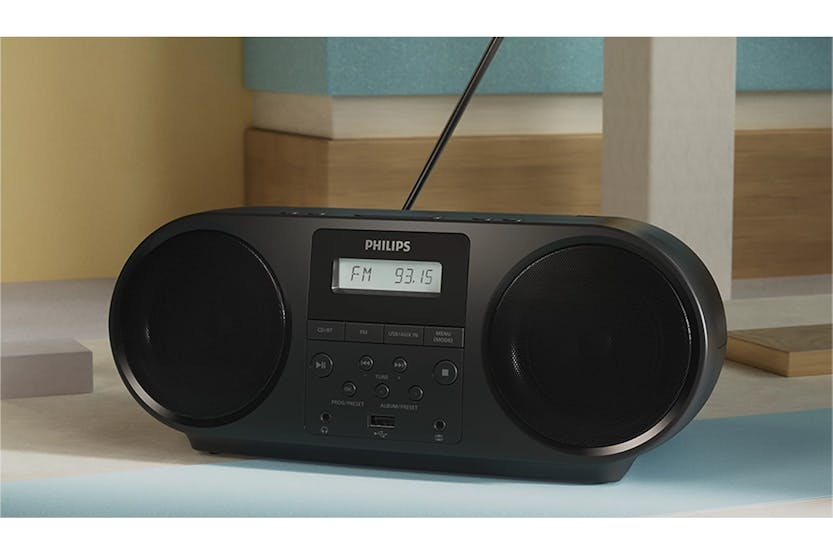 Description All-in-one CD/FM Radio Player Classic or modern? This boombox-style multi-source CD player is both. You can play physical CDs in any format, and it offers clear FM radio, Bluetooth streaming and more. There's a socket for headphones and a handy companion app too. Portable Boombox-style CD Player Whether you're discovering the joy of physical CDs for the first time or all over again, this top-loading CD player is a great choice for casual listening. It can read any kind of CD format and the carry handle makes it easy to move around. Simply plug into an AC outlet or insert six batteries (type R14 C, batteries not included) and take it outside. Digital FM Radio With Up to 30 Presets Embrace the music source that's been around longer than CDs! The FM digital tuner delivers clear reception: you can set up to 30 presets and programme your three favourite stations for instant access via the CD player or the virtual remote control in the Philips companion app. Bluetooth 5.4 for Better Sound and Auracast Streaming Auracast is supported, so you'll be able to play music on this CD soundmachine from multiple Auracast-compatible transmitting devices (including smartphones) around the house. The LC3 codec is supported for noticeably better sound when streaming. Easily Connect Headphones and Other Sources Want to be immersed in your sounds? Simply plug your wired headphones in to the 3.5 mm headphone socket. For more playback options, the USB port lets you plug in a flash drive loaded with MP3 files or you can connect legacy audio devices or turntables to the Audio in port. Philips Entertainment App. Simple Sound Control Controlling the CD player remotely is simple with handy companion app. A virtual remote control appears on the screen of your smart device and you can use it to switch between sources, select radio presets, adjust volume, enhance the bass, set the sleep timer, set display brightness and more. What's in the Box: AC power cord Product Features: Multi-source CD player Bluetooth 5.4, audio in, USB 3.5 mm headphone socket Output power (RMS): 4 W Sound system: Stereo Bluetooth profiles: A2DP, AVRCP, Streaming format: SBC, LC3 Tuner bands: FM stereo Antenna type: Telescopic Brightness control Disc playback modes: Fast forward/reverse, next/previous track search, repeat play, shuffle play Playback media: CD, CD-R, CD-RW, MP3-CD Bluetooth mode: Play/pause, previous/next Two 3" speaker drivers. 4 W (RMS). Dynamic bass boost Built-in carrying handle. Operates via AC or batteries LCD with adjustable brightness, programmable sleep timer