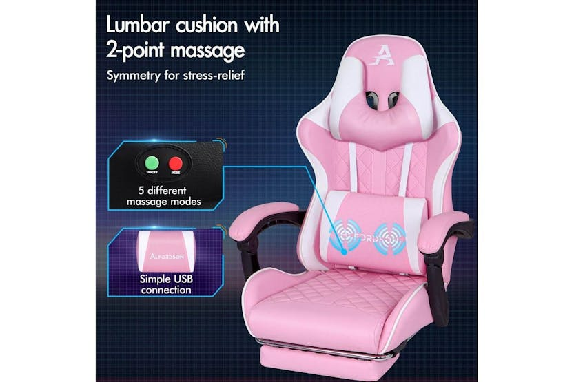 Description ONLINE ONLY Alfordson Gaming Chair | High-Back Faux Leather | Pink Upgrade your gaming and work experience with the Alfordson Gaming Chair, designed for those who demand comfort, durability, and style. Whether you are a dedicated gamer, a busy professional, or someone who spends long hours at the desk, this high-back gaming chair delivers the ultimate in ergonomic support and luxury. Finished in a striking pink faux leather, it is the perfect addition to any modern Irish home office or gaming setup. Engineered with a heavy-duty all-metal frame, the Alfordson Gaming Chair offers exceptional stability and longevity. The S-curve design and extra-wide, taller backrest are tailored to fit your body, eliminating back and shoulder pressure during long sessions. The whole-piece moulding foam padding in the car-seat grade base seat ensures ultra comfort, while the triple-layer seat construction combines premium PU leather and resilience foam for lasting support. Enjoy personalised comfort with up to 150-degree back recline adjustment, allowing you to find the perfect position for gaming, working, or even taking a quick nap. The removable, height-adjustable extra-large lumbar pillow and U-shape headrest provide superior support, reducing fatigue and promoting healthy posture. For moments of relaxation, simply extend the retractable padded footrest and unwind in style. Designed for versatility, this chair is ideal as a gaming chair, office chair, computer chair, or executive chair. The deluxe PP plastic armrests with padding offer wide, supportive comfort, while the sporty nylon base adds a touch of colour and resists dirt. Premium universal wheels and a smooth 360-degree swivel ensure effortless movement across any surface, making it easy to transition between tasks. With a high weight capacity of up to 180kg, the Alfordson Gaming Chair is built to accommodate a wide range of users. The Intertek supreme PU leather is both stylish and easy to clean, while the SGS gas-lift and TUV caster wheels guarantee safety and reliability. Make a statement in your workspace or gaming room with this eye-catching pink chair that combines performance, comfort, and flair. Key Features: Heavy-duty all-metal frame for enhanced durability Ergonomic S-curve design with wider and taller backrest Whole-piece moulding foam padding for superior comfort Up to 150-degree back recline adjustment Removable, height-adjustable extra-large lumbar pillow U-shape headrest for optimal neck support Retractable padded footrest for relaxation Deluxe padded armrests and sporty nylon base Premium universal wheels and 360-degree swivel High weight capacity: supports up to 180kg Stylish pink faux leather finish Specifications: Material: Intertek supreme PU leather, resilience foam Frame: All-metal Base: Sporty nylon Wheels: TUV caster wheels Gas-lift: SGS certified Colour: Pink Weight Capacity: 180kg Included Items: 1 x Alfordson Gaming Chair 1 x Assembly Manual