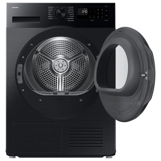 Upgrade your laundry routine with the Samsung Series 5 AI Energy 9kg Heat Pump Tumble Dryer in sleek black. This innovative appliance features AI technology that automatically adjusts drying time and energy usage based on the load, ensuring optimal efficiency. With a spacious 9kg capacity, it can handle large loads with ease, while the heat pump technology gently dries clothes at lower temperatures to protect fabrics and save energy. The DV90DG52A0ABEU also boasts a range of convenient features such as a reversible door for flexible installation and a sensor drying system that prevents over-drying. Make laundry day a breeze with this high-performance tumble dryer from Samsung.