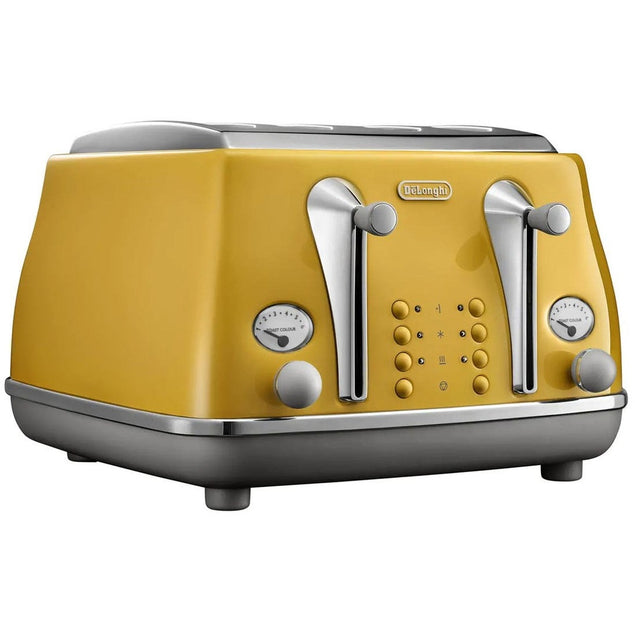 Upgrade your morning routine with the DeLonghi Icona Capitals 4 Slice Toaster. This sleek and stylish toaster features a vibrant yellow finish that adds a pop of color to your kitchen. With four slots, you can easily toast bread, bagels, and more to perfection. The variable browning control allows you to customize your toast to your preferred level of crispiness, while the extra lift position makes it easy to remove smaller items without burning your fingers. Equipped with a removable crumb tray for easy cleaning and a defrost function for frozen bread, the DeLonghi Icona Capitals 4 Slice Toaster is both functional and stylish. Whether you're a toast connoisseur or just looking for a reliable appliance to streamline your breakfast routine, this toaster is a must-have for any kitchen. Upgrade your morning routine with this high-quality toaster that combines style and functionality effortlessly.