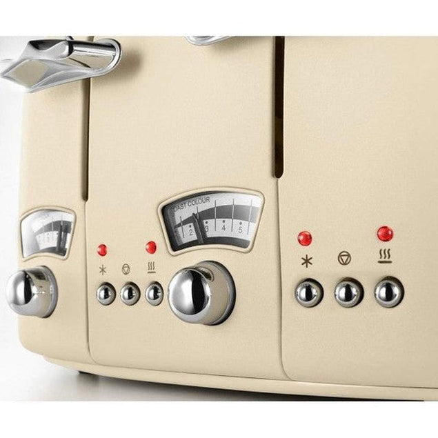 Upgrade your morning routine with the De'Longhi Argento Flora 4 Slice Toaster in Cream. This stylish toaster features four wide slots, perfect for toasting all types of bread, bagels, and pastries. With six adjustable browning settings, you can achieve your desired level of toastiness every time. The high-lift mechanism makes it easy to retrieve smaller items without burning your fingers, while the removable crumb tray ensures effortless cleaning. Add a touch of elegance to your kitchen with the De'Longhi Argento Flora 4 Slice Toaster. Designed with both style and functionality in mind, the De'Longhi Argento Flora 4 Slice Toaster in Cream is a must-have for any modern kitchen. Its sleek design and compact size make it a versatile addition to your countertop. Whether you prefer a light golden toast or a crispy crunch, this toaster delivers consistent results with every use. Start your day off right with the De'Longhi Argento Flora 4 Slice Toaster - the perfect blend of beauty and performance.