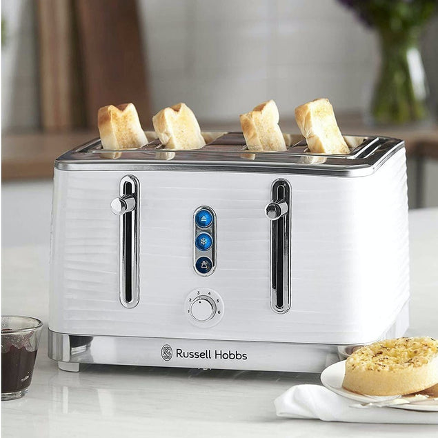 Upgrade your breakfast routine with the Russell Hobbs Inspire 4 Slice White Toaster. This sleek and modern toaster features a high-lift function for easy removal of smaller slices, as well as variable browning control to ensure your toast is perfectly crispy every time. With extra-wide slots to accommodate a variety of bread sizes, this toaster is perfect for busy mornings or leisurely brunches. The Russell Hobbs Inspire 4 Slice White Toaster also includes a frozen bread function, cancel button, and removable crumb tray for easy cleaning. Its stylish white design will complement any kitchen decor, making it a practical and stylish addition to your countertop. Start your day off right with this reliable and efficient toaster from Russell Hobbs.