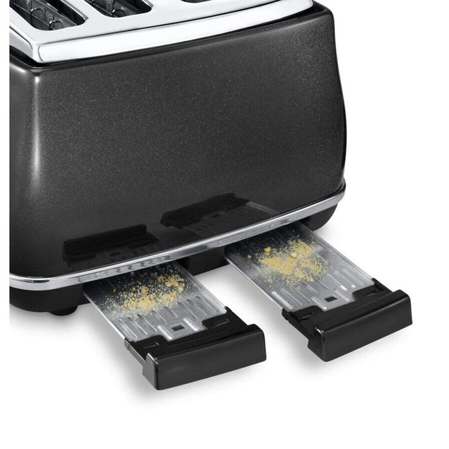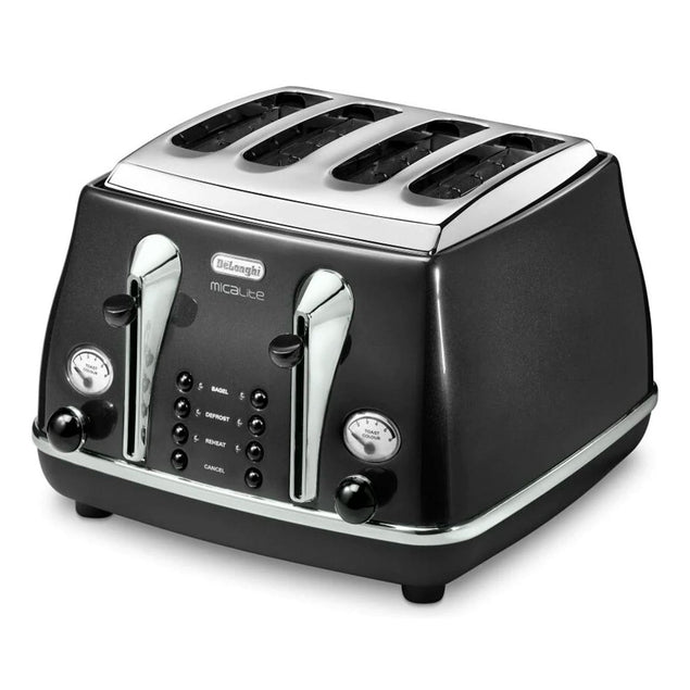 Upgrade your morning routine with the De'Longhi Icona Micalite 4-Slice Toaster. This sleek and stylish toaster features four slots, allowing you to toast multiple slices of bread at once. With its adjustable browning controls and reheat, defrost, and cancel functions, you can customize your toast to perfection every time. The Icona Micalite Toaster also has a removable crumb tray for easy cleaning and a high lift function for easy removal of smaller items like bagels or English muffins. Add a touch of modern elegance to your kitchen with the De'Longhi Icona Micalite 4-Slice Toaster. The CTOM4003.BK model is designed with both style and functionality in mind, making it a must-have appliance for any kitchen. Whether you prefer a light golden brown or a crispy dark toast, this toaster has you covered. Its compact design and black finish make it a versatile addition to any countertop. Start your day off right with the De'Longhi Icona Micalite 4-Slice Toaster and enjoy perfectly toasted bread every time.