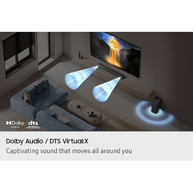Enhance your home entertainment experience with the Samsung B450F B-Series 2.1-Channel Soundbar. This sleek and powerful soundbar comes with a wireless subwoofer, delivering rich and immersive audio that will elevate your movie nights and music listening sessions. With 200 watts of total power output, you can enjoy crystal-clear sound quality and deep bass that fills the room. The Samsung B450F Soundbar is designed to seamlessly integrate with your TV and other devices, offering multiple connectivity options including Bluetooth and HDMI ARC. Its compact size and modern design make it a stylish addition to any living room or home theater setup. Bring your favorite movies, TV shows, and music to life with the Samsung B450F Soundbar and experience audio like never before.