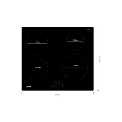 Neff N30 60cm Built In Induction Hob T36FBE1L0 Product Information: Simple, minimalist cooktop control. Manage all your hob settings with just one touch. The integrated timer keeps track of the time whenever you need to boil or bake on the clock. POWER BOOST (INDUCTION AND ELECTRIC!) Power Boost is our smart, time-saving cooking hack. Want to boil your pasta water in a flash? Simply activate Power Boost to heat it much faster. Get a flexible boost for your dishes. INDUCTION Our induction hobs are as varied as our chefs. They have just one thing in common: Thanks to the intuitive operation of the TwistPad or TwistPadFire, there’s nothing to distract you from what really makes cooking worthwhile: the joy of experimentation. Product Specification: Gas Cooktop: Cooker top induction Total number of positions that can be used at the same time: 4 Cooking zone flexibility: Ring Zone Frame type: Facet Type of control: Touch Control Avoid scorching with frying sensor: Not applicable Plug type: No plug (electrical connection by electrician) Home Connect: No Basic surface material: Ceramic Colour of appliance: Black Frame type: Facet Dimensions: 51 x 592 x 522 mm Type of appliance width: 60 cm Min. required niche size for installation (HxWxD): 51 x 560-560 x 490-500 mm Installation niche size for flush appliances: mm Minimum worktop thickness: 16 mm Connection Rating: 4600 W Length electrical supply cord: 110.0 cm Plug type: No plug (electrical connection by electrician) Dimensions of the heating elements: 1 x 14,5 cm Ø, 1 x 21,0 cm Ø, 2 x 18,0 cm Ø Power of the heating elements: 1 x 1.4 (2.2) kW, 1 x 2.2 (3.7) kW, 2 x 1.8 (3.1) kW Number of electric warming zones: 0 Zone Light : No Favourite button: No Hotplate control settings: Variable 17-stage power settings for each zone Keep warm function: No Timer: Count-down timer (on appliance), Switch-off timer (on appliance) Heating with booster: All Automatic boil start: No Automatic linking/ separating of cooking zones: No Increase/ decrease power level via Power Move: No Power Transfer: No Automatic zone selection: No Quick Start: Yes Restart: Yes Quick switch-off: Yes Energy consumption display: No Find the right setting with Dish assistant: No Cooking Sensor: No Cooking Sensor Ready: No Avoid scorching with frying sensor: Not applicable Home Connect: No Control your hood with your Home Connect hob: No Smart Hood Automatic: No Smart Home Trigger for individual configuration: No Power consumption off: W Power consumption standby/display on: W Power consumption standby/display off: 0.5 W Time auto-standby/network: min Time auto-off: min Time auto-standby/display on: min Time auto-standby/displ. off: 20.0 min Power consumption standby/network: Please check the user manual for how to switch off the WiFi module.: W Residual heat indicator: Separate Safety device: Pan Recognition, Childproof Lock, Safety time-switch-off, Power management function Number of plate on indicators: 0 Model: T36FBE1L0 Barcode: 4242004264330 Manufacturer: