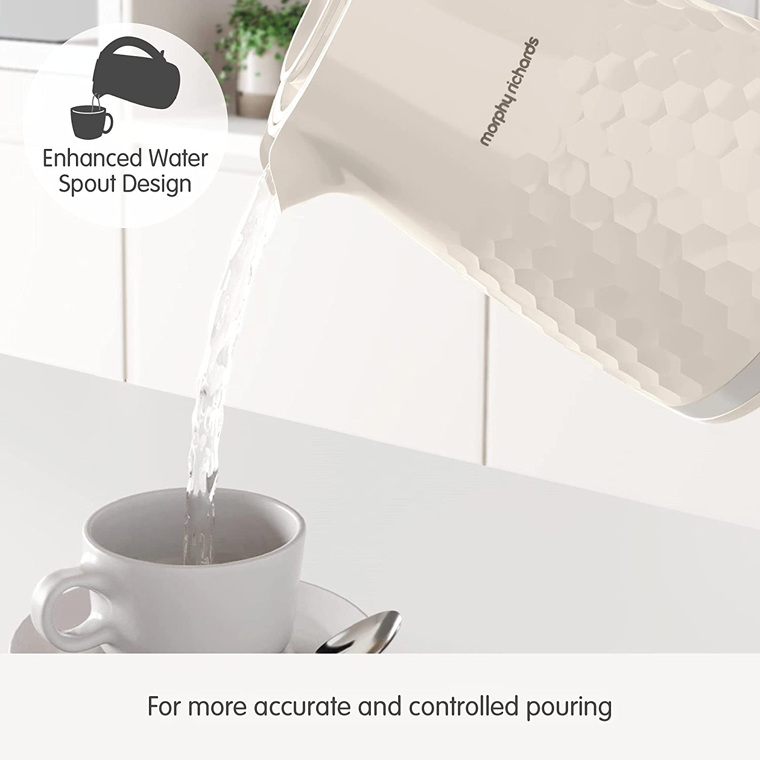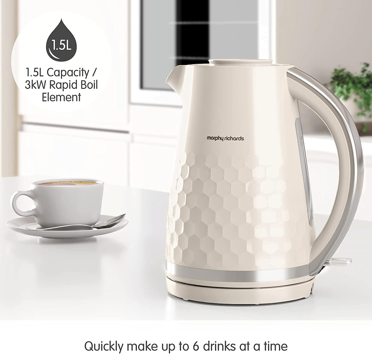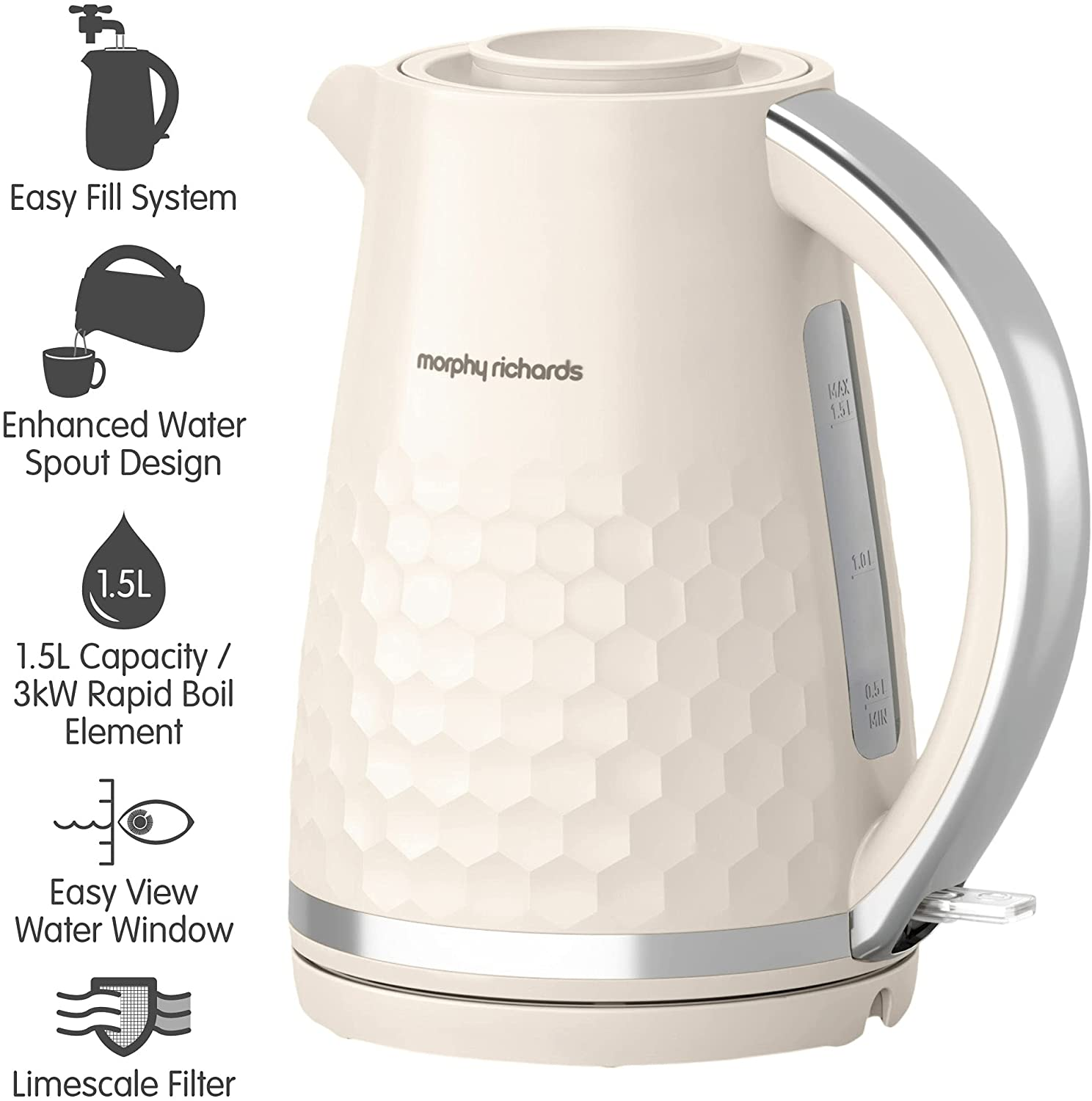 Hive ultra-stylish on-trend patterned plastic kettle with a premium gloss finish, let Hive make a statement in your kitchen. Featuring an innovative filling system – which doesn’t require you to remove or open a lid to refill your kettle, giving more seamless use. Easy Fill System Hive features an innovative filling system – which doesn’t require you to remove or open a lid to refill your kettle, giving more seamless use. Enhanced Water Spout Design The Hive spout is designed with precision in mind, and gives you more accurate and controlled pouring – meaning no more mopping up spills. 1.5 Litre Capacity and 3kW Rapid Boil Element The large 1.5 litre capacity makes the Hive kettle perfect for serving family and friends, as you can boil water for up to six drinks in one go. Additionally, the powerful 3kW element means the kettle boils rapidly, meaning less waiting around for your drinks. Easy View Water Window No need to boil more water than you require – the easy view water window enables you to easily see how much water is inside the kettle, making it more energy efficient. Limescale Filter The Hive kettle comes complete with a removable limescale filter, ensuring you get the perfect hot drink every time. 360 Degree Base The 360 degree base allows you to dock the Hive kettle from any direction, giving more flexibility and ease of use whether you are left or right handed. Cord Tidy The built-in cord tidy enables you to keep your worktop clutter free by concealing any excess, unneeded cord.