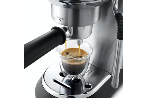 Exquisite taste combined with aesthetic pleasure. Dedica, the stylish pump espresso machine, now with My Latte Art steam wand: perfect to create the silky, fine texture to make your lattes and flat whites. Make the most of any drink. Where there is taste, time stands still. Perfection lies in the detail with charming finishing touches in a chic, matte tone.Today, the joy of coffee begins with visual pleasure. A minimalist design to enhance comfort and easy to use. An intuitive 3 function control panel for a simple, instantaneous pleasure. Depth: 305 MM Height: 149 MM Width: 330 MM ThermoBlock heating system: always the perfect temperature. Self-priming system mean the machine is always ready for use. Flow stop function to personalise your coffee length. 15-bar pump New filter baskets: higher coffee dose capacity (up to 16 gram) for a better in cup result. Available also for ESE pod. My Latte art steam wand: perfect to ceate the silky, fine texture to make your Lattes & Flat Whites Special. Double Drip Tray: two-level cup holder to house glasses and tall cups of up to 13cm for long coffee and milk drinks. Slim desnsions: only 15cm width Full Metal Body Cup warmer on top