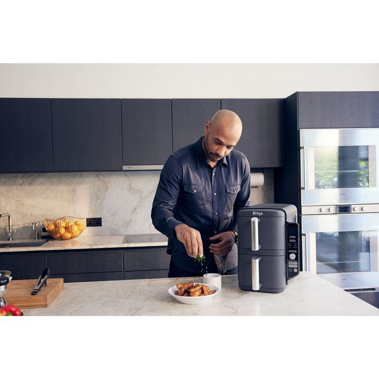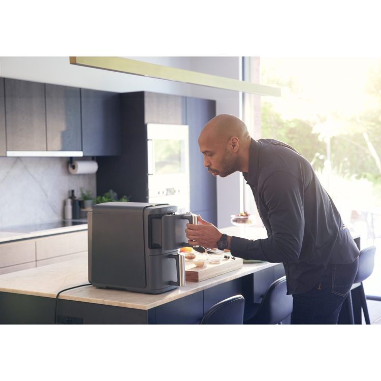 Cooking zones stacked above each other to reduce footprint Up to 75% less fat than traditional frying methods. 50% faster cooking than a fan oven* Super-fast airflow for even heating and crisping Variable temperature from 40°C to 240°C to gentle remove moisture for a crisp finish. Varying fan speeds: 1200 RPM – 2600 RPM. Easy to clean non-stick coating COOKS 4 FOODS AT ONCE Independent air fry drawers with Stacked Meal Racks allow you to cook on 4 separate levels. XL FAMILY-SIZED CAPACITY 9.5L capacity lets you cook a whole 1.5kg roast chicken in each drawer and feed up to 8 people. MATCH Match your cook settings across all levels for the full 9.5L capacity at once. Wattage 2460W Capacity 9.5L Capacity, holds 4 chicken breasts Settings Digital Timer 6 programmable cooking functions: Max Crisp, Air Fry, Roast, Bake, Reheat and Dehydrate. Accessories Stepped Crisper Plate for better grilling