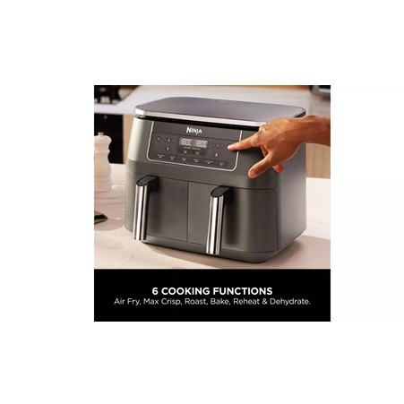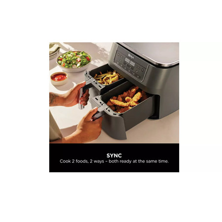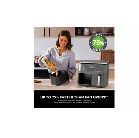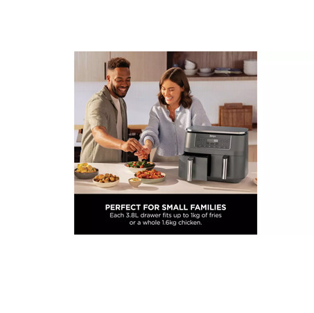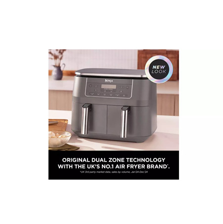 Introducing the Ninja 6-in-1 Dual Zone Air Fryer DZ300UK. New design with dark grey metallic trim. With 2 separate cooking drawers, you can SYNC or MATCH cooking programs and finish times for total versatility. The 7.6L capacity feeds 6-8 people. Each drawer fits a 1.6kg chicken. Features Dual Zone Technology – Cook 2 foods, 2 ways – both ready at the same time 6 Cooking Functions – Air Fry, Max Crisp, Roast, Bake, Dehydrate, Reheat 7.6L Capacity – Feeds 6-8 people. Fit a 1.6kg chicken in each drawer Energy-Efficient – Save money on your oven energy bill Quick Meals – Up to 75% faster than fan ovens** Air Fry – Up to 75% less fat than traditional frying methods*** 2 Independent Cooking Zones Mix and match cooking functions, times and temperatures across 2 separate cooking drawers to create endless meal options. Get creative with 6 ways to cook: Air Fry, Max Crisp, Roast, Bake, Reheat and Dehydrate. SYNC Cooking Mode Cook 2 different foods with different temperatures, times and settings using 2 separate cooking drawers – and have both ready to serve at the same time. No need to use different appliances, or let your side go cold while your main finishes cooking. MATCH Cooking Mode Use the MATCH feature to duplicate the same function, time and temperature settings across both drawers – perfect for doubling your serving size or cooking two different foods with the same instructions. Easy To Clean The non-stick drawers and crisper plates are dishwasher-safe for easy clean-up. Get started straight away. There’s a Chef-Created Recipe Guide included in the box, packed with Ninja Air Fryer recipes. Specification Product Weight: 8.2kg Product Dimensions (cm): H:31.5 x W:38 x D:26.5cm Cord Length: 0.8m Capacity: 7.6L Wattage: 2470W Dish Washer Safe Components: Yes Timer: Yes Pre-Set Functions: Max Crisp, Air Fry, Roast, Reheat, Dehydrate, Bake Manufacturers Guarantee: 2 Years What’s in the Box Main Unit 2470W 2 X 3.8L Drawers 2 x Non-Stick Crisper Plates Instruction Booklet Inspiration Guide