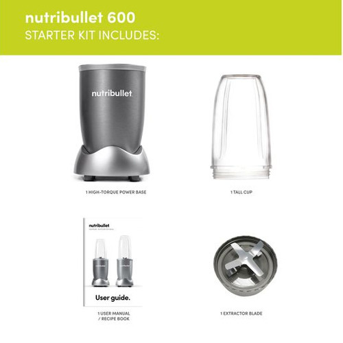 NutriBullet Starter Kit Thanks to a powerful 600 watt motor combined with bullet cyclonic action , everything is pushed through the turbo extractor blades for beautifully smooth results. It bursts open seeds, cracks through stems, and shreds tough skins to get the most out of your fruit and vegetables. The sleek and compact design is the perfect size for your kitchen counter-top. The original NutriBullet. Powerful Nutrient Extractor Nutribullet’s powerful 600W motor and cyclonic technology creates delicious NutriBlasts by breaking down vegetables, fruits and nuts for maximum nutrition extraction. Set includes: 1 x high torque power base, 1 x extractor blade, 1 x tall cup (680ml) and quick Start Guide with recipes. Quick, easy to use and simple to clean – just rinse under warm water. Great for fresh, healthy breakfasts to kick-start your morning and whole-food nutrition throughout the day