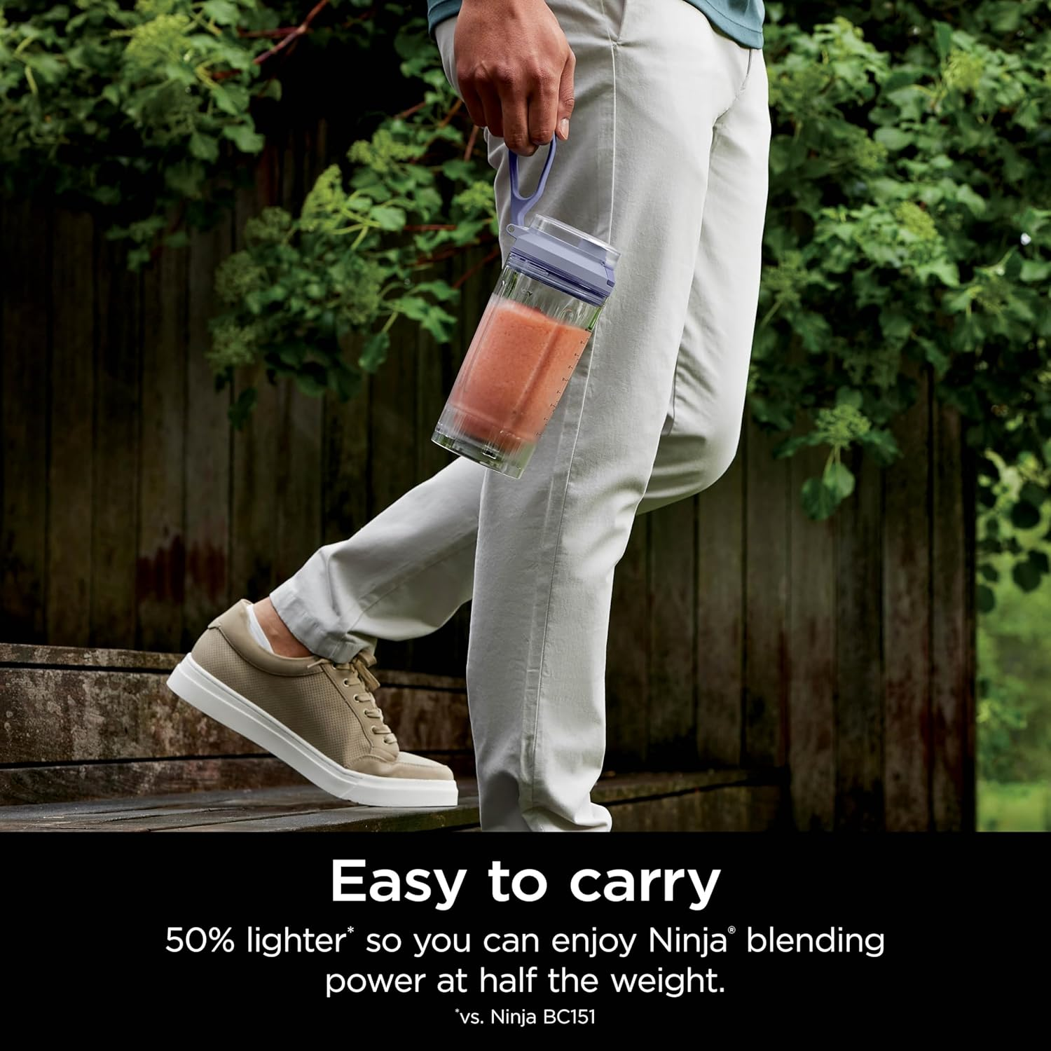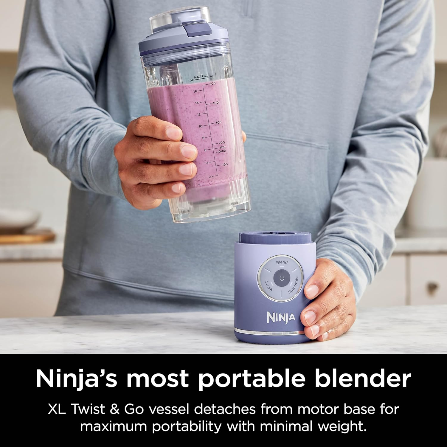 Ninja’s most powerful cordless blender: Sharp blades blast through ice & tough ingredients in seconds Long-lasting battery life: Blend on-the-go with up to 25 blends per full charge 3x blending functions: Automatic Crush & Smoothie programmes, plus Manual Blend mode Removable Twist & Go cup: Light & portable blending with leak-proof sip lid & carry handle. Powerful 11.1 volt battery Includes: Ninja Blast motor base, 570ml** Twist & Go cup with built-in CrushBlade, leak-proof lid, charging cable & Recipe Guide. Dimensions: H: 30 x W: 9 x D: 11.5 cm. Weight: 1.3kg. Colour: Lavender.