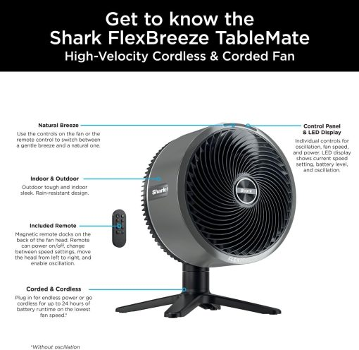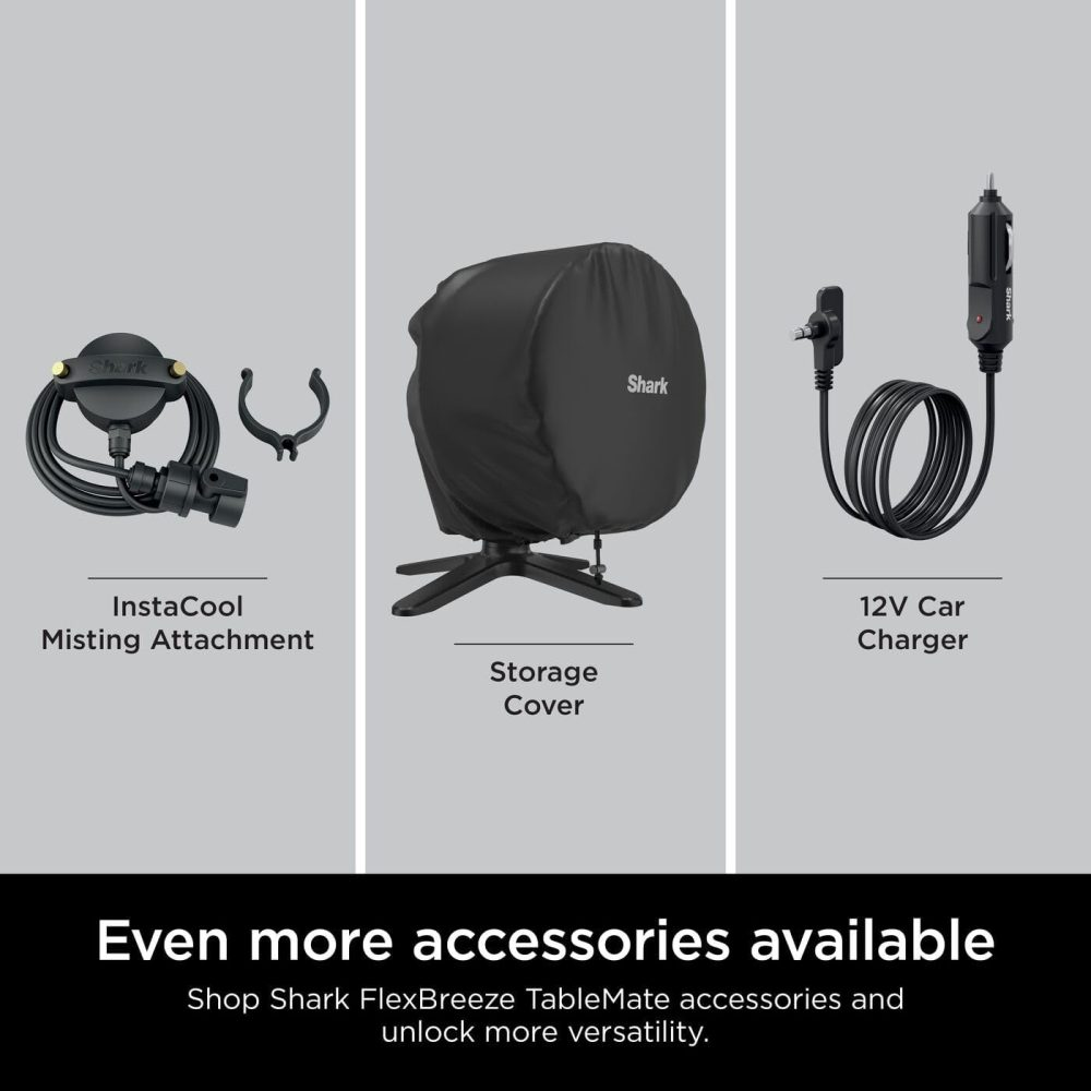 The Shark FlexBreeze TableMate delivers exceptional cooling power. The Shark FlexBreeze TableMate keeps you cool both inside and outside the home. When plugged in, it automatically charges, ensuring it’s always ready to go. With its easy-carry handle, lightweight design, and up to 24 hours of cordless runtime, it’s perfect for keeping cool on the move. Features Corded & cordless with up to 24 hours* of cordless runtime. Powerful cooling — up to 20m cooling reach. Customise your cooling – 5 adjustable speeds, 180° oscillation & 55° tilt. Quiet Performance – perfect for sleeping and working at home. UV & water-resistant design** – tough enough for the outdoors, rain or shine. Customisable Cooling With the Shark FlexBreeze TableMate you can fine-tune your cooling with five fan speeds, 180 degrees of side-to-side oscillation, and a 55° tilt to keep the air circulating so everyone stays cool. Powerful Performance The high-velocity fan has a reach of up to 20 meters, delivering a cooling breeze even from a distance. Sleek, Tough, and Quietly Cool A sleek, minimalist design makes the Shark FlexBreeze TableMate a stylish addition to the home. Durable and Quiet Design Its rain and UV resistance** help resist fading and discolouration from the sun, making it suitable for outdoor use, rain or shine. Quiet and unobtrusive at any speed, it’s perfect for sleeping, working from home, or enjoying a quiet evening on the patio. Made for Misting The FlexBreeze TableMate Compatible with Shark’s cooling misting attachment (sold separately), which reduces temperatures by up to 5° Celsius.*** 2-Year Guarantee. Specification Product Weight: 3kg Product Dimensions (cm): H:40cm W:35cm L:40cm Wattage: 36W Number of Speeds: 5 Material: Plastic Guarantee: 2 Years