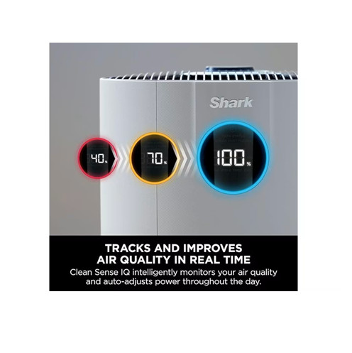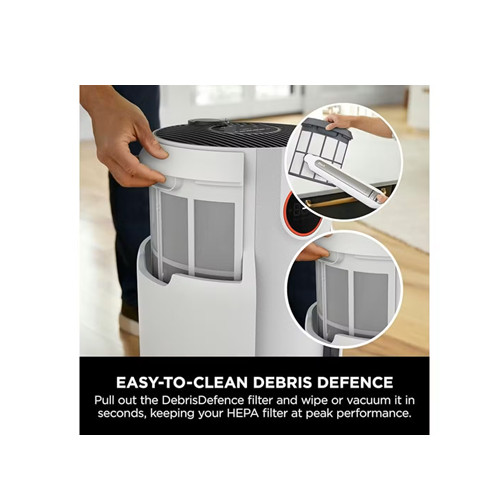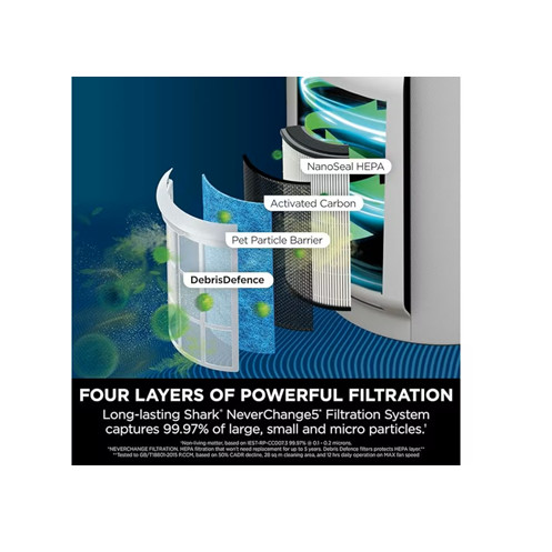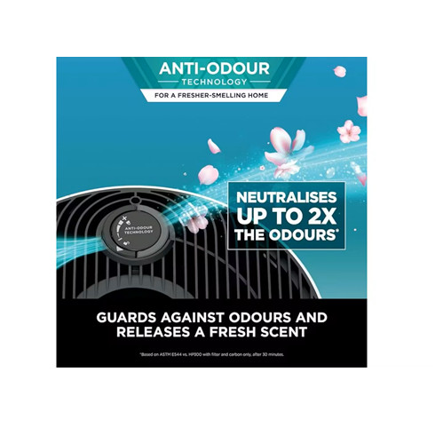 Introducing powerful purification and odour control in one HEPA air purifier, monitoring your air quality and automatically adjusting cleaning power, giving you confidence in the air you breathe. The best bit? There’s no need to replace your filter for up to 5 years*. Shark’s NeverChange5 Filtration System won’t need replacement for up to 5 years*, thanks to a DebrisDefence pre-filter which protects the HEPA layer, prevents build-up of hair, dust or dander, and maximises performance. That’s up to 10x the lifespan of some other filters. This powerful air filtration system captures and traps 99.97% of allergens and irritants, including micro, small and large particles to effectively remove dust, pollen, pet dander, allergens and micropollutants***. Benefit from 4 layers of powerful filtration: NanoSeal HEPA to capture dust and smoke, Activated Carbon to neutralise odours and gases, a Pet Particle Barrier to guard against dander and allergens, and an easy-to-clean DebrisDefence pre-filter. Simply remove the screen to vacuum, wipe or rinse the DebrisDefence filter clean in seconds to maintain peak performance. Anti-Odour Technology for a fresher-smelling home. Anti-Odour Technology guards against odours and releases a fresh scent as it cleans. An integrated cartridge neutralises up to 2x the odours†, so you can say goodbye to everyday smells such as those caused by cooking, pets, smoke and more. Easily adjust the scent level with a simple dial. Auto-adjusts cleaning power. Clean Sense IQ monitors air quality and automatically reacts to changes in the environment, adjusting the cleaning power to efficiently remove dust, pollen, smoke, pollution and allergens from your air. See the air quality improve before your eyes with the real-time results and updates displayed on an easy-to-read LED screen. Easily view the amount of Particulate Matter (PM) in your air at any time of day – toggle between PM10 (including dust and pollen), PSQ M.5 (including smoke and pollution) and PM1 (including allergens). Perfect for a good night’s sleep. This powerful air purifier is ideal for overnight use with quiet performance and dimmable lights for minimal sleep interruption. Coverage : Purify areas up to 60m2 with 1 air change per hour. Rooms of up to 12m2 will benefit from 4.8 air changes per hour.***** For your peace of mind, Shark offers a free 2-year guarantee (UK & ROI only). Included in the box: 1. 1x NeverChange5 Air Purifier HP150UK 2. 1x NeverChange5 HEPA Filter 3. 1x Anti-Odour Technology Cartridge. *Tested to GB/T18801-2015 P.CCM, based on 50% CADR decline, 12 sq m cleaning area, and 12 hrs daily operation on MAX fan speed. ***Based on ASTM E544 vs. HP150 with filter and carbon only, after 30 minutes. †Non-living matter, based on IEST-RP-CC007.3 99.97% @ 0.1 – 0.2 microns. ***** Based on AHAM AC-1-2020, tested in max mode