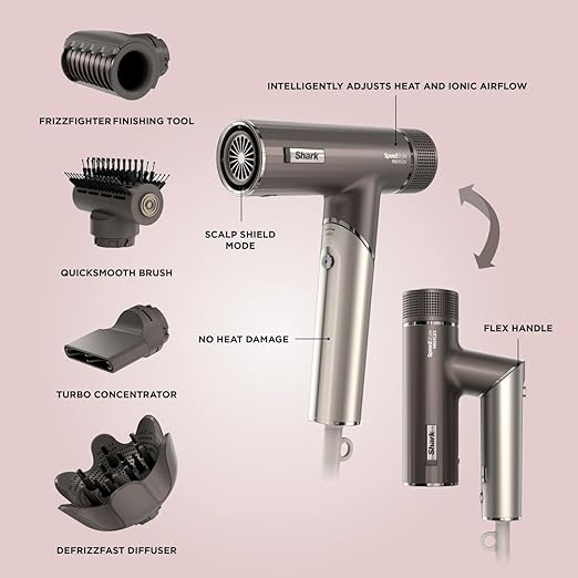 Powerful, lightweight hair dryer for all hair types Folding handle for compact storage Scalp Shield Mode – designed to protect new hair growth from extreme heat 4 styling attachments for flawless, salon-quality looks with no heat damage & less frizz* Includes FrizzFighter Finishing Tool, QuickSmooth Brush, Turbo Concentrator, DefrizzFast Diffuser Colour: Mocha/ Silver 2-year guarantee upon registration with Shark (UK & ROI only)