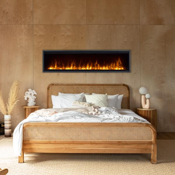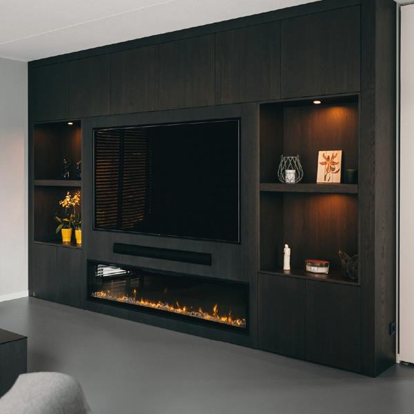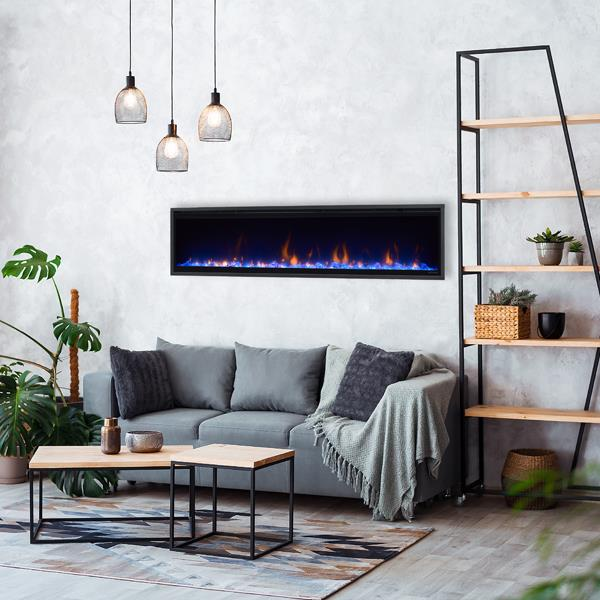 A contemporary electric fire that lets the LED flames become the main feature. The Dimplex Ignite 60 has a stunning, landscape look with edge-to-edge flames creating a simple, yet spectacular focal point for your home. A superb choice for combing within a media wall setting, the Ignite 60 can be enjoyed all year round with just the low energy LED flames or, when needed, the fire features a concealed heater capable of providing a boost of heat up to 2kW. The Dimplex Ignite 60 has a standard flame option designed to mimic the charm and character of a real fire. Dancing flames rise from a ‘Acrylic Ice’ fuel effect creating a lovely, cosy atmosphere in the room. You also have the option of five additional colour themes or cycle through the variety of colours giving you flexibility to choose a theme to suit your home, you can also adjust the flame brightness and the acrylic ice fuel bed offers a contemporary look. Supplied with a modern ‘Acrylic Ice’ fuel effect as standard. Giving the look of random shaped crystals, this adds to the contemporary look of this feature fire. You also have the option to purchase an additional ‘Driftwood River Rock’ fuel effect which creates another stylish look to the fire. The Driftwood River Rock comprises of Realistic logs crafted from authentic driftwood and tumbled river rock that captures and refracts the LED light below the media bed. Comfort Saver technology automatically adjusts the fan speed and temperature to precisely match the requirements of the room based on the thermostat setting. If the temperature in the room rises significantly, i.e. sun coming through a window or central heating turns on, the heater will turn off and periodically turn back on to circulate the air around the unit, until the room temperature drops and requires the heater to be constantly on again.