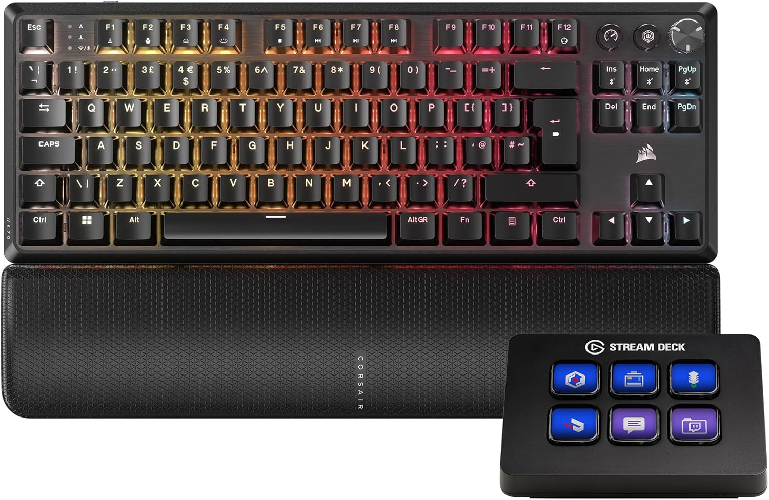 About this item K70 CORE TKL WIRELESS: The compact tenkeyless footprint fits in tight gaming setups and leaves more room for sweeping mouse movements. Pre-Lubed MLX Red v2 Switches: Pre-lubricated CORSAIR MLX Red v2 linear mechanical switches deliver smooth, responsive, and stable keystrokes, with enhanced ultra-bright per-key RGB backlighting. Fast Wireless Connectivity: Connect via ultra-fast SLIPSTREAM WIRELESS v1.5 or versatile Bluetooth, secured by AES encryption. Fastest Tap Wins*: FlashTap is a revolutionary technology that puts the player in complete control of their movement keys, optimizing SOCD behavior across every game and genre. * FlashTap will be disabled by default both in HW mode and iCUE Elgato Stream Deck Mini: Forget keyboard shortcuts. Stream Deck Mini lets you assign tedious, hard to memorise shortcuts to a single key. Instantly identify and activate them without error. Compatible with your apps: Seamlessly integrate with essential software including Zoom, Teams, PowerPoint, Excel, Word, GoogleSuite, MS Office, Photoshop, Adobe Creative Apps, Spotify, Music, and many more. Customisable LCD keys: Instantly activate commands and functions with a single tap. Easy Set Up: User-Friendly Software. Drag actions onto keys. Then personalise settings with ease. › See more product details