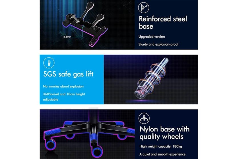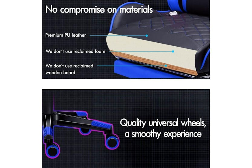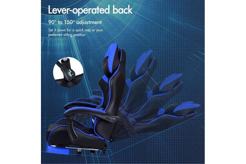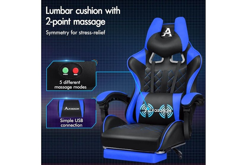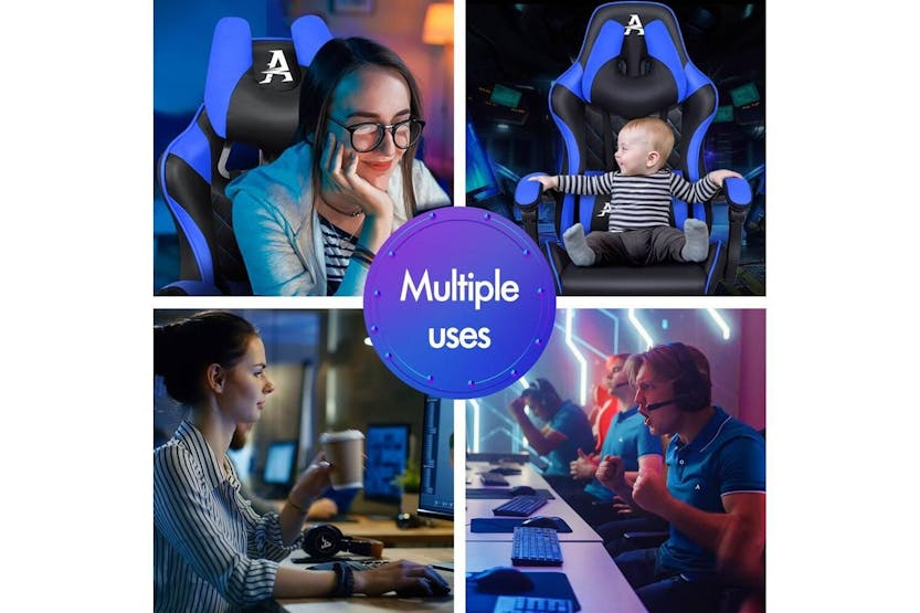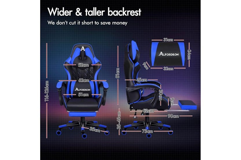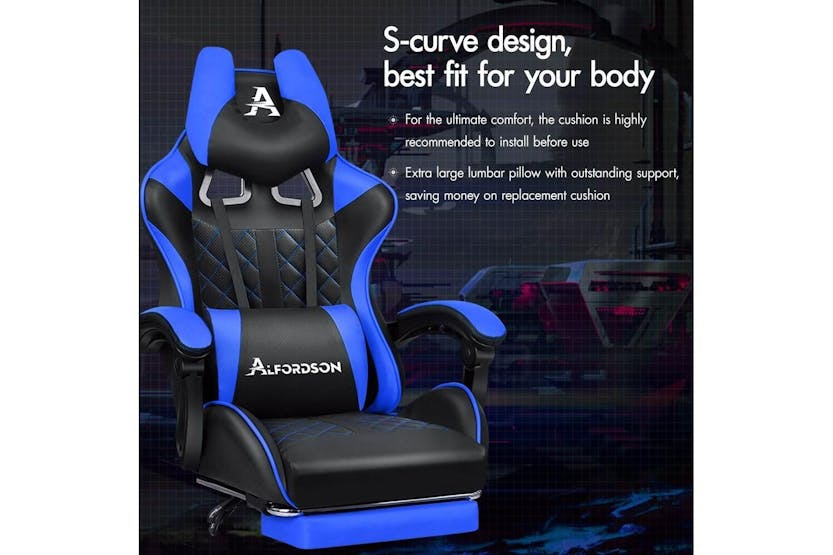 Description ONLINE ONLY -FREE DELIVERY Alfordson Gaming Chair | High-Back Faux Leather | Blue Upgrade your gaming and office experience with the Alfordson Gaming Chair, designed for those who demand comfort, durability, and style. Whether you are a dedicated gamer, a remote worker, or simply looking for a premium office chair, this high-back faux leather chair delivers the ultimate in ergonomic support and luxury. With its striking blue finish and sporty design, it is the perfect addition to any Irish home office or gaming setup. Engineered for long hours of use, the Alfordson Gaming Chair features a heavy-duty all-metal frame for enhanced durability and stability. The S-curve, wider and taller backrest is expertly contoured to fit your body, helping to eliminate back and shoulder pressure during intense gaming sessions or extended workdays. The generous, high-resilience moulding foam padding in the car-seat grade base seat ensures you stay comfortable, no matter how long you sit. Enjoy personalised comfort with up to 150-degree back recline adjustment, allowing you to find the perfect position for gaming, working, or even taking a quick nap. The removable and height-adjustable extra-large lumbar pillow and U-shape headrest provide superior support, reducing fatigue and promoting healthy posture. For added relaxation, the retractable padded footrest is ideal for stretching out and unwinding between tasks. Designed for smooth movement, the Alfordson Gaming Chair is equipped with premium universal wheels and a 360-degree swivel, making it easy to move around your workspace. The deluxe PP plastic armrests with padding offer wide, supportive comfort, while the sporty nylon base adds a touch of colour and resists dirt better than standard plastic bases. This chair is versatile enough to serve as a gaming chair, office chair, computer chair, or executive chair, making it a smart investment for any Irish household. Key Features: Heavy-duty all-metal frame for long-lasting durability Ergonomic S-curve, wider and taller backrest for optimal support High-resilience, whole-piece moulding foam padding for superior comfort Up to 150-degree back recline adjustment for personalised seating Removable, height-adjustable extra-large lumbar pillow and U-shape headrest Retractable padded footrest for added relaxation Premium universal wheels and smooth 360-degree swivel Deluxe padded armrests and sporty, easy-to-clean nylon base Versatile use: gaming, office, computer, or executive chair Specifications: Material: Intertek supreme PU leather Seat: Triple-layer (PU leather + resilience foam) Frame: All-metal construction Gas-lift: SGS certified Wheels: TUV caster wheels Weight Capacity: Up to 180kg Colour: Blue Included Items: 1 x Alfordson Gaming Chair 1 x Assembly Manual Transform your workspace or gaming area with the Alfordson Gaming Chair. Combining ergonomic design, premium materials, and versatile functionality, it is the ideal choice for Irish gamers and professionals seeking comfort and style in one impressive package.