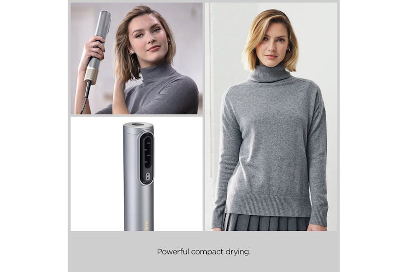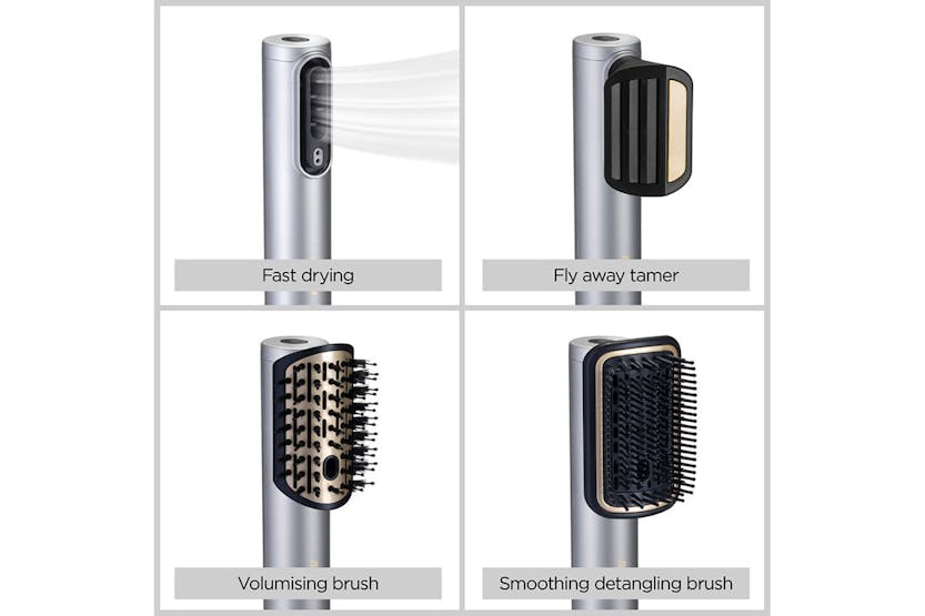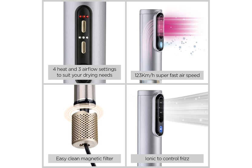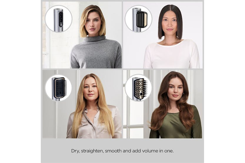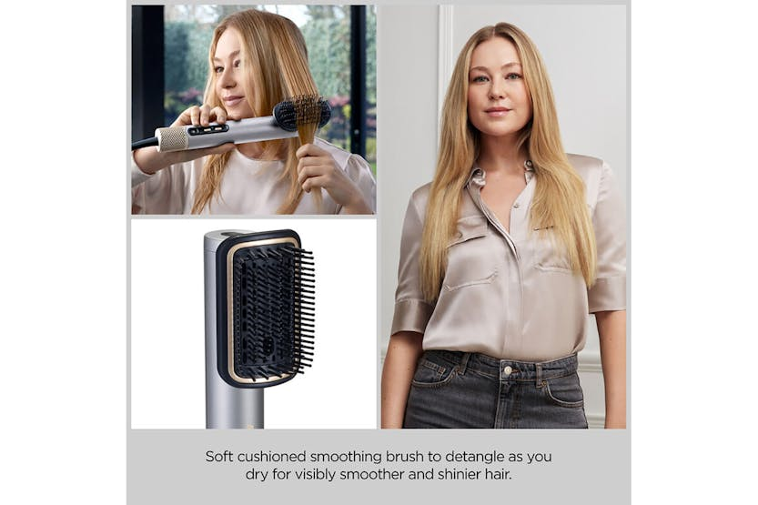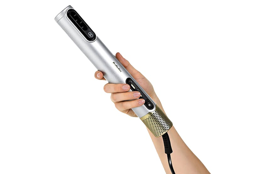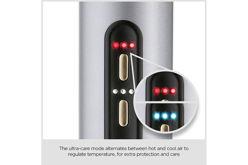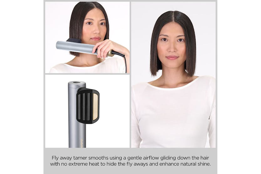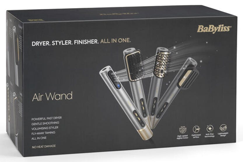 Description Wet to Dry volumising, smoothing and hiding fly- aways, all powered by air. Fast, effortless drying, easy smoothing and styling, all in one, with no heat damage. The BaByliss Air Wand Limited Edition dries, volumises and smooths styles with enhanced shine, all in one, for effortless time saving. Powerful Drying Super-fast 123km/hr air speed and advanced airflow technology give all the drying power of a regular hair dryer. Fly-away Taming Gentle airflow glides down the hair to hide flyaways for a smooth finish with natural shine Effortless Volumising A curved oval brush with a perfect combination of detangling and polishing bristles to smooth and volumise for an easy blow-dry finish. Gentle Smoothing Soft air cushioned brush to protect the scalp. With flexible ball tipped bristles that gently detangles without tugging for smooth,shiny hair. Product Features: Precise airflow system: Specially designed air channels deliver optimised heat, air speed and pressure for effective smoothing and shaping. Ultra-care mode: Advanced ultra-care mode alternates between hot and cool air carefully regulating the heat on the hair. High speed digital motor: Lightweight, long-life high speed digital motor, specially designed for high-performance drying.Lightweight, long-life high speed digital motor, specially designed for high-performance drying. Airflow and temperature control: 3 airflow settings and 4 temperature settings give a range of wet to dry styling combinations for all hair types. Ultra lightweight: Only 380g - babyliss lightest dryer yet. Specially designed for total ease of use. Anti frizz technology: Advanced dual-ionic system combining positive and negative ions to eliminate frizz and fly-aways. No heat damage: Powerful drying with carefully controlled heat for fast results with no heat damage. Magnetic rear filter: Easy clean removable magnetic rear filter. Salon length cord: 2.5m long length salon cord