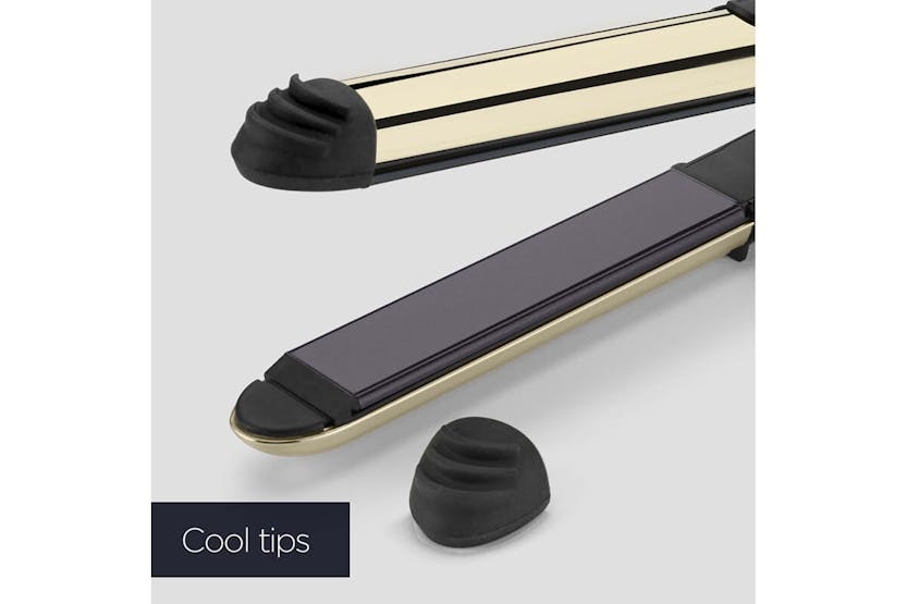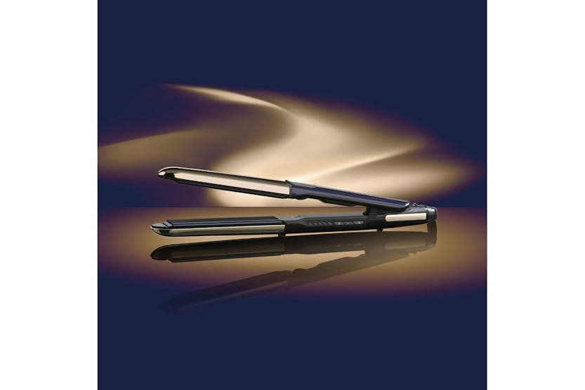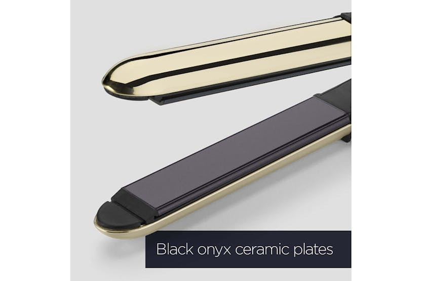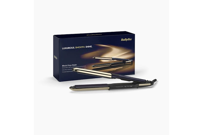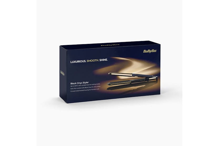 Achieve sleek, smooth hair with the BaByliss Black Onyx Hair Straightener | ST484U. Featuring a fast-response Advanced Ceramics heating system and 5 temperature settings, this styler offers controlled styling for all hair types. The longer-length ceramic plates infused with black onyx effortlessly glide through hair, while ionic technology controls frizz for ultra-smooth, shiny results. With a rounded metal housing for creating curls and waves, this styler is a versatile addition to your styling routine. Get ready to experience lasting smoothness and professional results with the BaByliss Black Onyx Hair Straightener. Part of the BaByliss Black Onyx Collection, this hair straightener is designed for fast styling with super-fast heat up in just 15 seconds. The auto shut off feature and 3m swivel cord offer convenience and safety, while slip-on cool tips make curling easy. Complete with a heat wrap for storage and travel, this styler is a must-have for achieving flawless hair styling results.