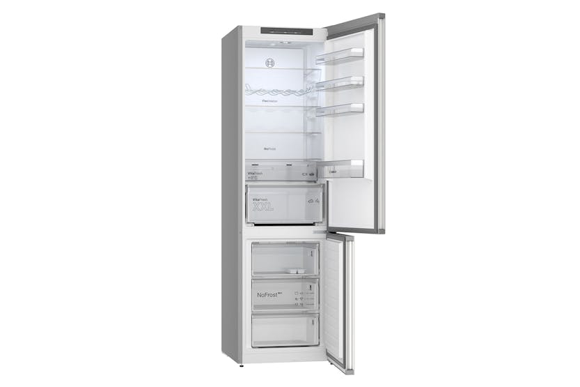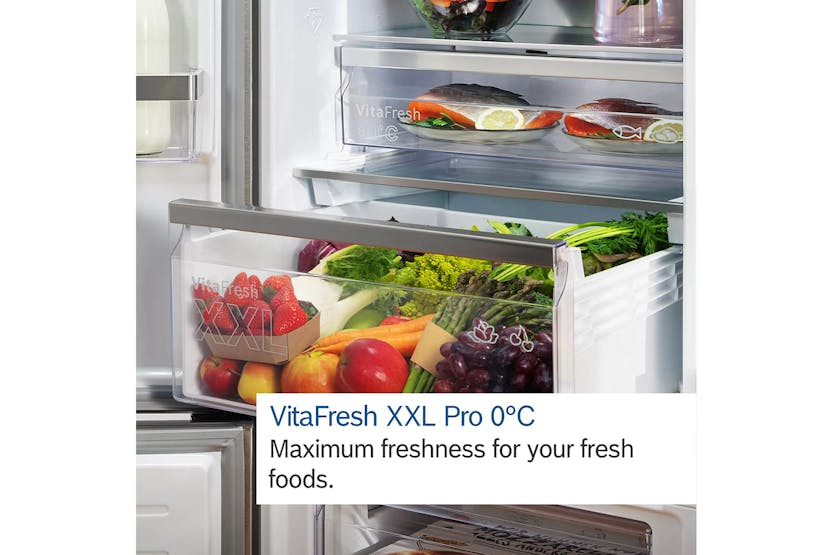 Keep your fresh foods at their peak with the Bosch Series 4 Freestanding Fridge Freezer | KGN392LDFG. Featuring VitaFresh XXL Pro 0°C technology, your fruits, vegetables, fish, and meat stay fresher for longer with optimal climate control. LED lighting, automatic super freezing, and two separate cooling circuits offer convenience, energy savings, and efficient cooling performance. With features like SuperCooling, NoFrost technology, and FreshSense sensors, this fridge-freezer ensures your food stays fresh, flavorful, and perfectly preserved without the hassle of defrosting. Experience maximum freshness and functionality with the Bosch Series 4 Freestanding Fridge Freezer | KGN392LDFG. This fridge-freezer offers ample storage space, LED interior lighting, NoFrost system, PerfectFit design, and VitaFresh drawers to keep your food fresh and organized. With separate cooling circuits, SuperCooling function, and MultiAirflow system, this appliance delivers consistent temperatures, efficient cooling, and optimal storage conditions for all your fresh foods. Upgrade your kitchen with this sleek and reliable fridge-freezer that enhances the longevity and quality of your groceries.